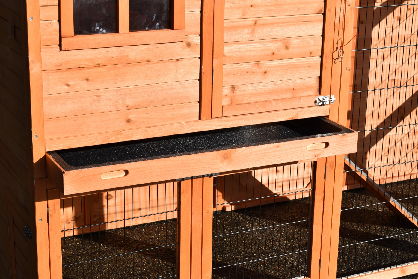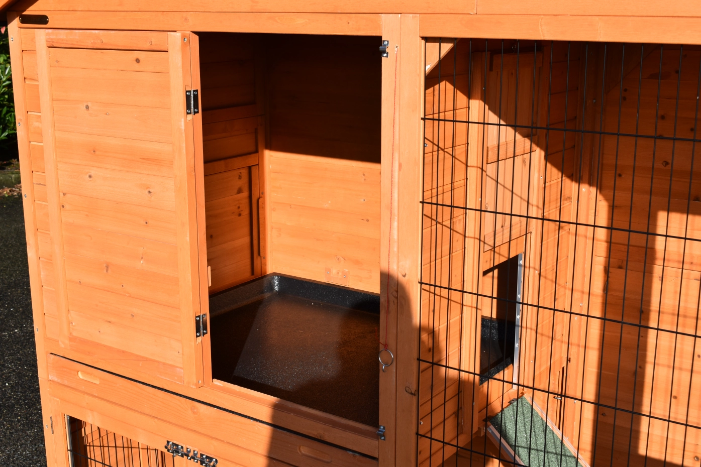 • Die Türen dieses Kaninchenstalls sind mit doppelten Schieberiegeln ausgestattet