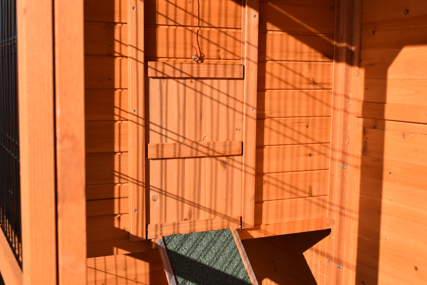 • Um diesen Stall mit einem Auslauf zu kombinieren, muss eine Tür oder ein Gitterteil entfernt werden.