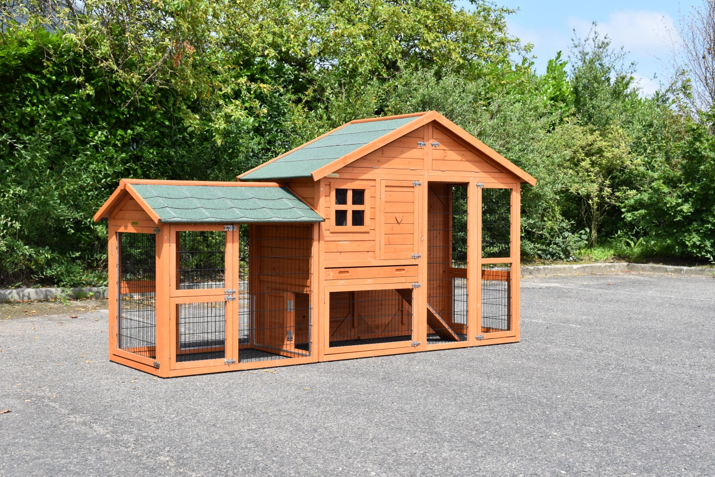 - Das Dach dieses Kaninchenstalls ist mit Dachpappe versehen.