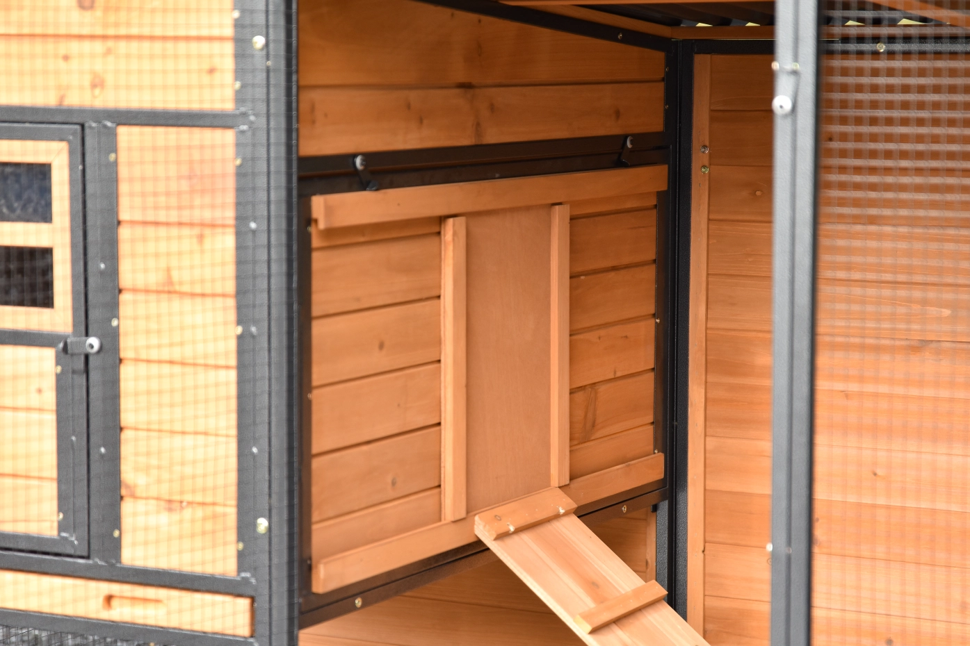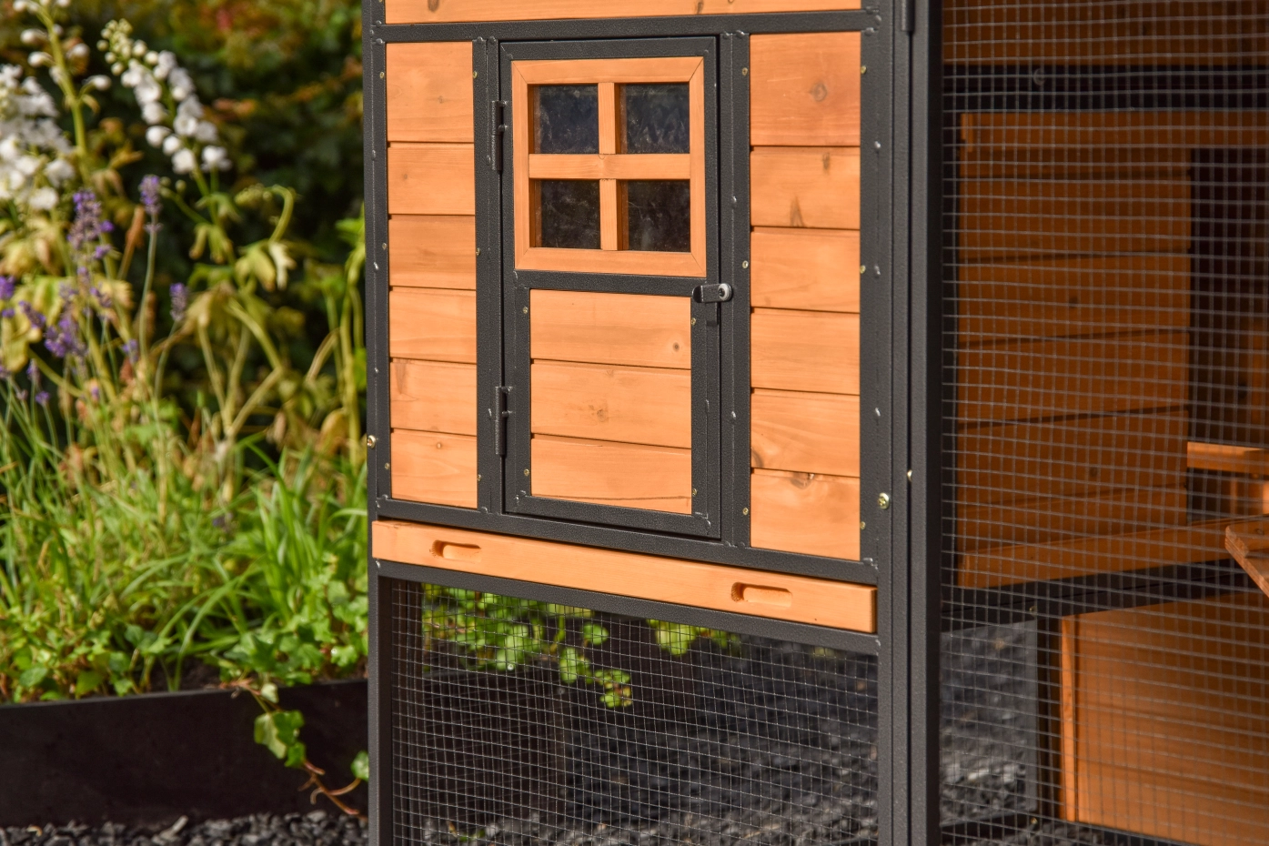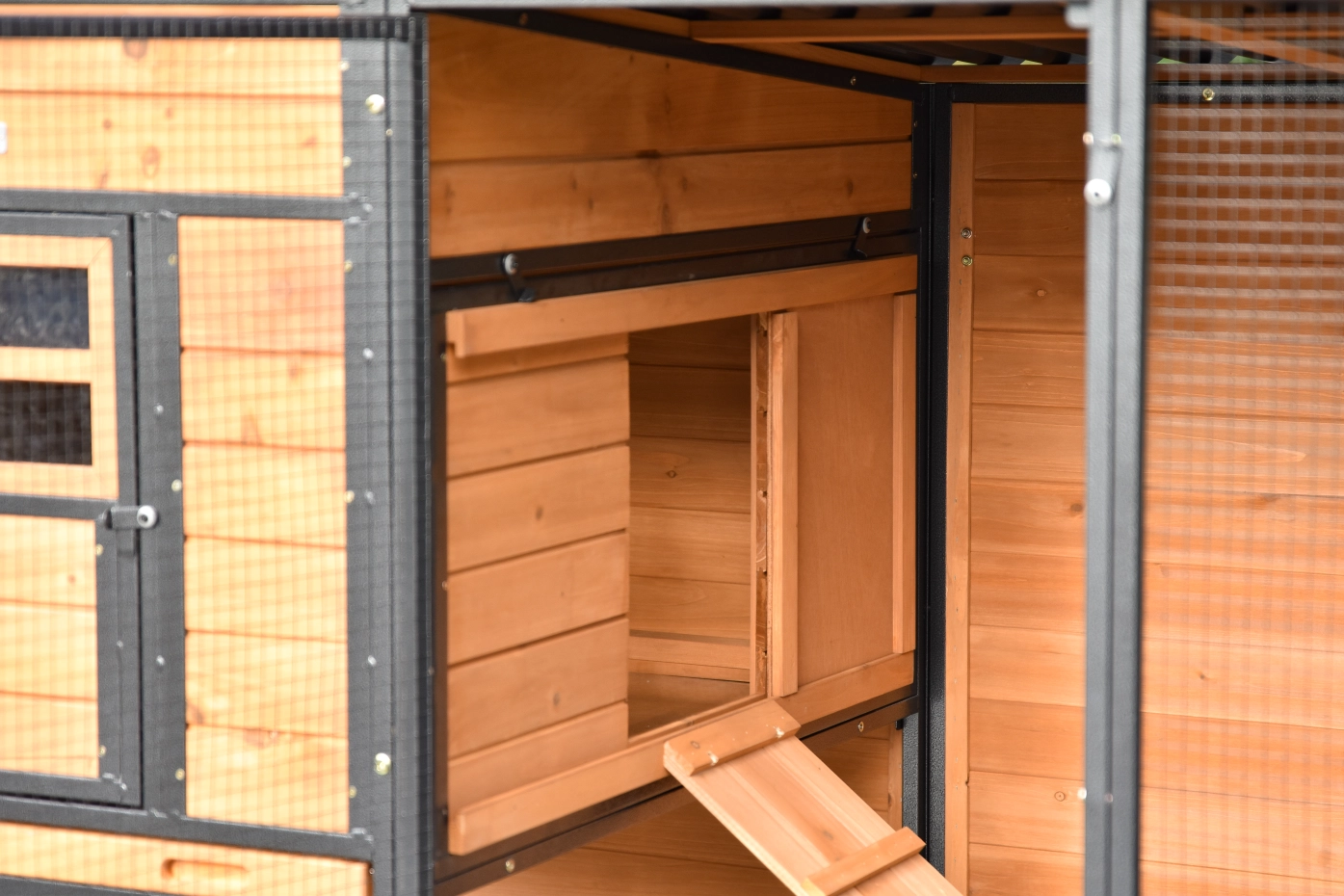 • Tierstall aus Kiefernholz mit stabilem, beschichtetem Stahlrahmen und schwarzem Drahtgitter
