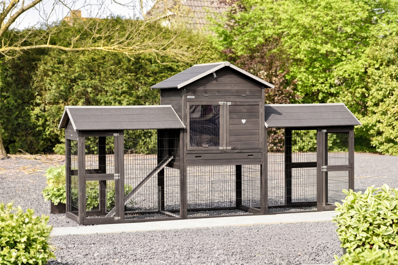 • Die Türen dieses Kaninchenstalls sind mit doppelten Schieberiegeln ausgestattet