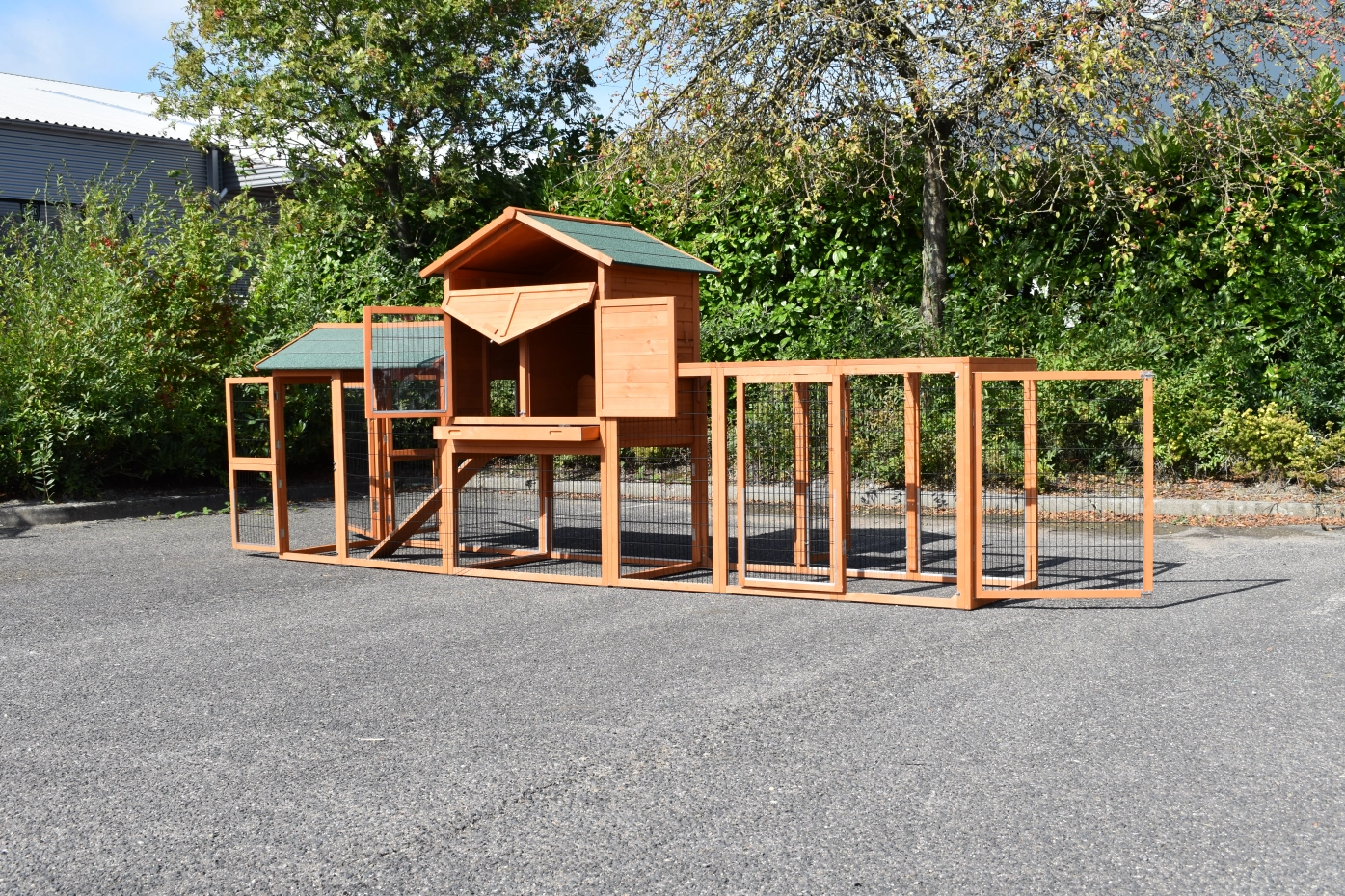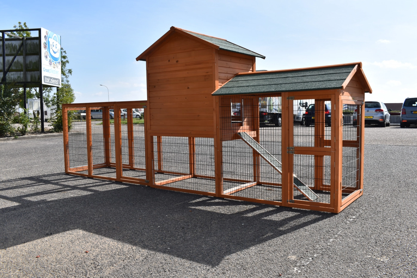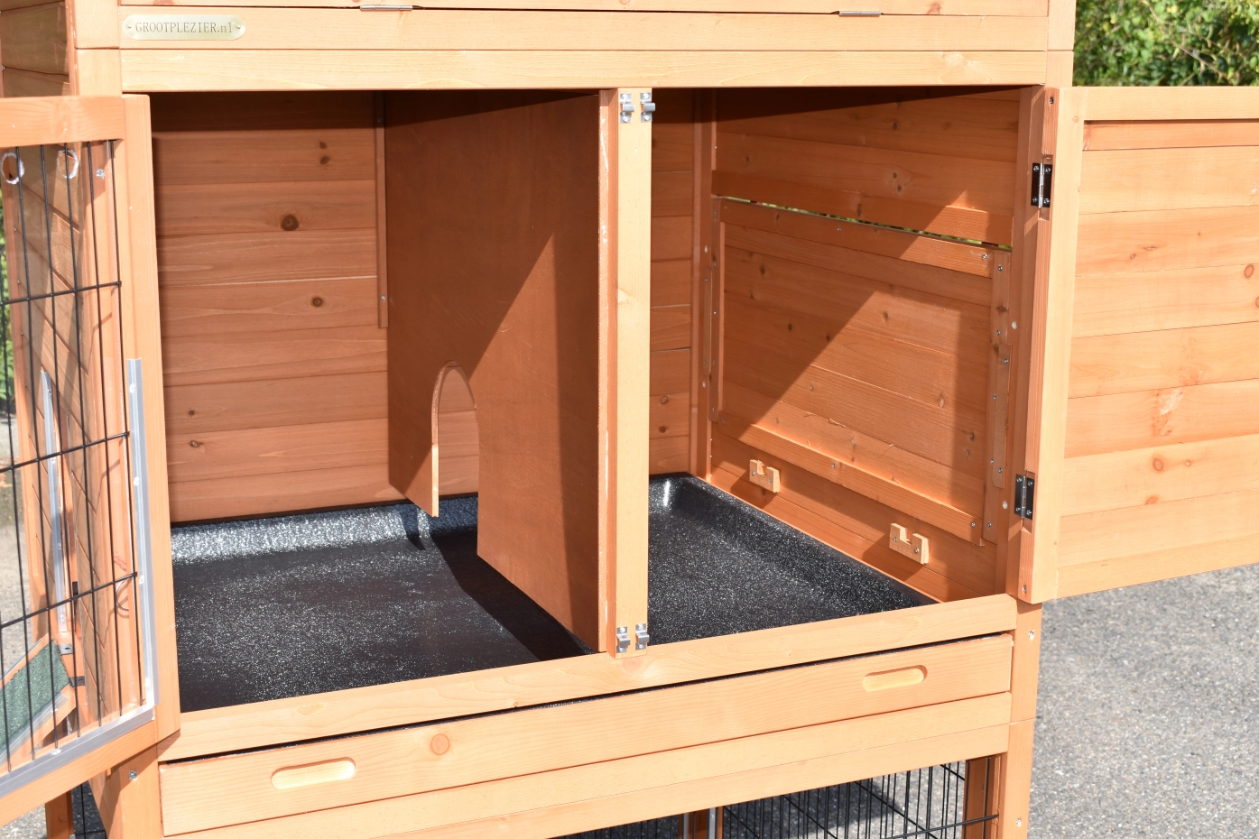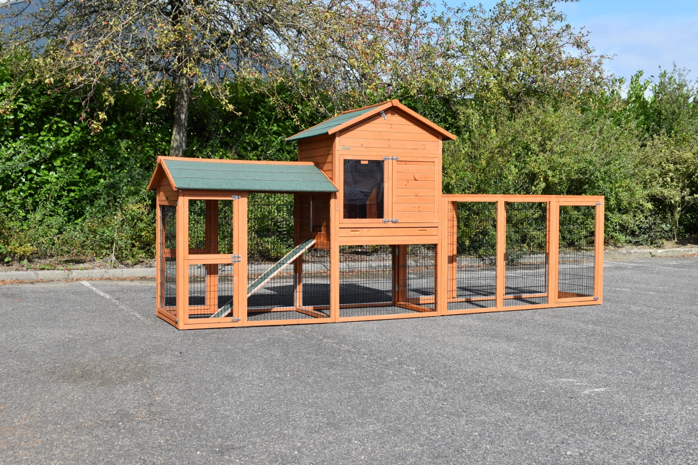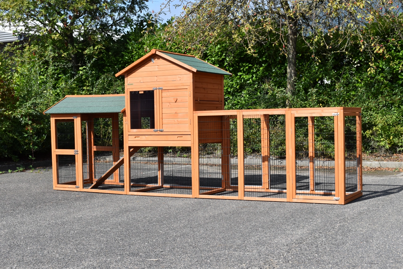 Kaninchenstall Prestige Large mit Freilaufgehege Functional ist eine geräumige und praktische Kombination für Ihre Kaninchen. Dieser große Stall ist bis ins Detail durchdacht, mit großzügigen Türen, einem geräumigen Nachthaus und großzügigen Ausläufen. Auf der rechten Seite der Auslauf Functional, auf der linken Seite der Auslauf Space Large.