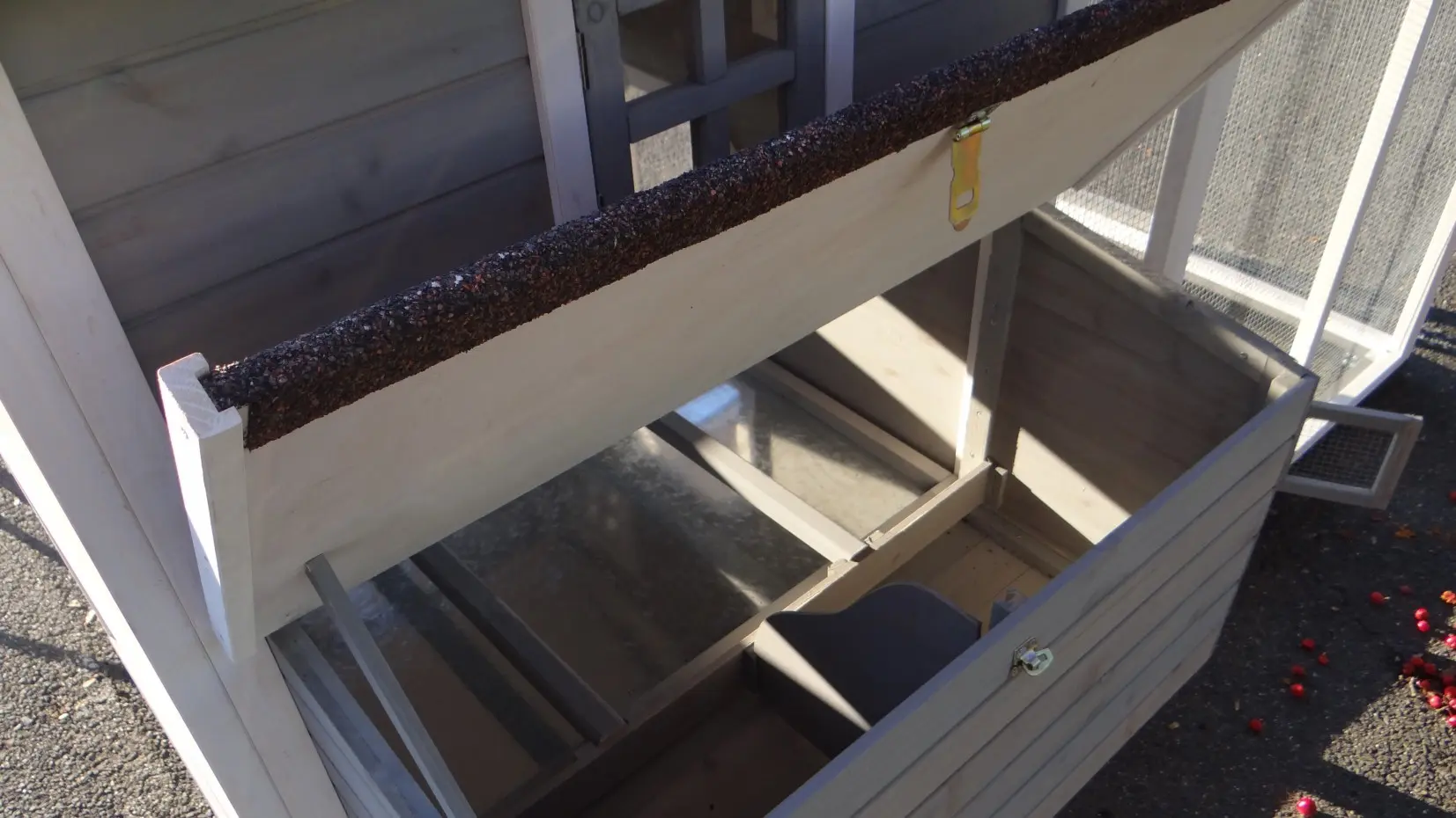 - Das Dach dieses Kaninchenstalls ist mit Dachpappe versehen.