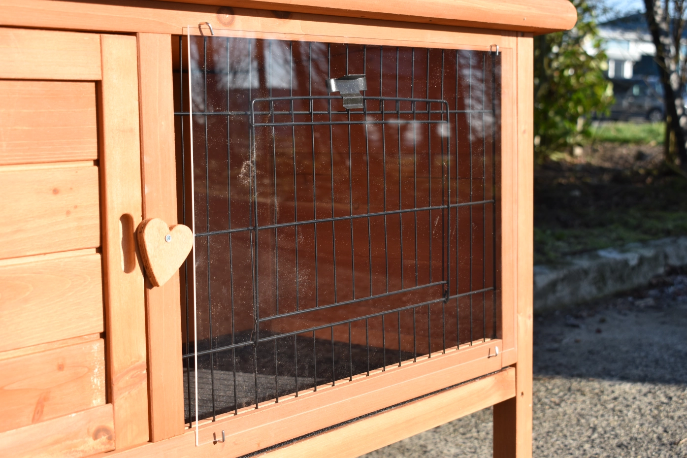 Auch für die Isolierung des Tierstalls Bumpy gibt es eine besonders praktische Lösung, um Ihre Kaninchen vor Regen, Wind und extremer Kälte zu schützen. Die Scheibe lässt sich sehr einfach herausnehmen, sodass Sie bei wechselnden Wetterbedingungen jederzeit entscheiden können, ob Sie die Scheibe vor den Gitterpaneelen anbringen oder nicht.