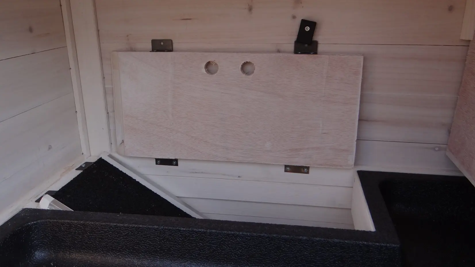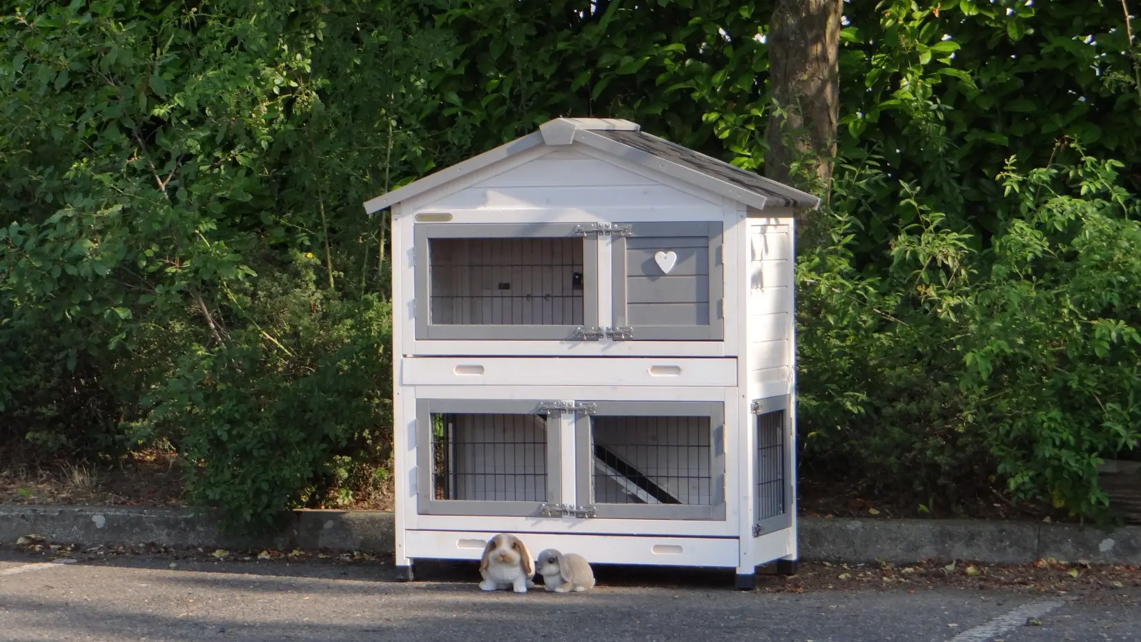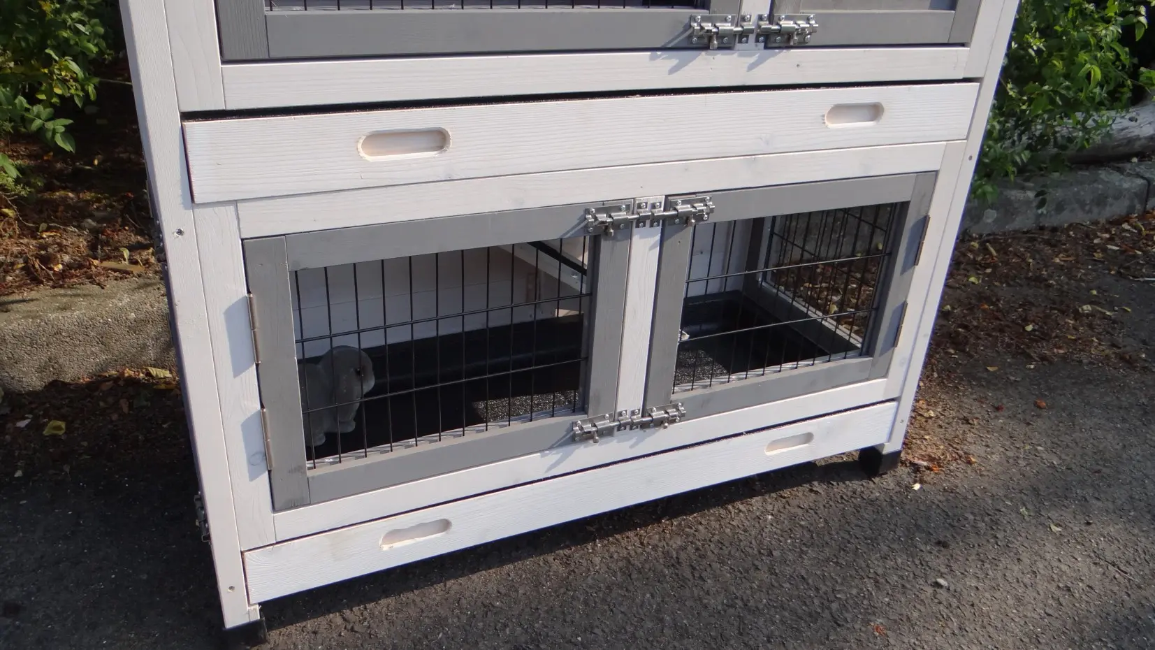 - Die Türen dieses Kaninchenstalls sind mit doppelten Schieberiegeln ausgestattet