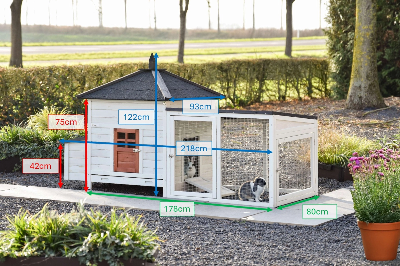 Das Stall ist eigentlich ein Hühnerstall, aber auch sehr geeignet für große Kaninchen. Bitte beachten Sie; Das Stall ist nicht mit Nagerschutz ausgestattet. Sie können die dabei kaufen. Die maximale Abmessungen, inklusives Dach und Auslauf sind 218x93x122cm.