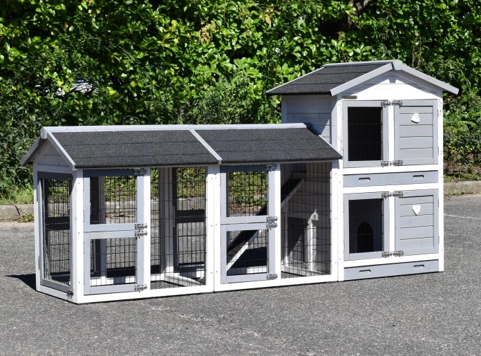 - Die Türen dieses Kaninchenstalls sind mit doppelten Schieberiegeln ausgestattet