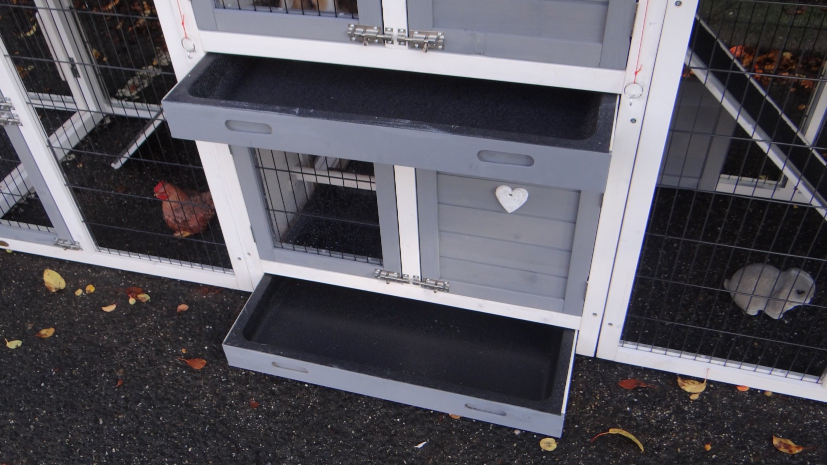 - Der Kaninchenstall besitzt eine praktische, herausziehbare Kotwanne.
