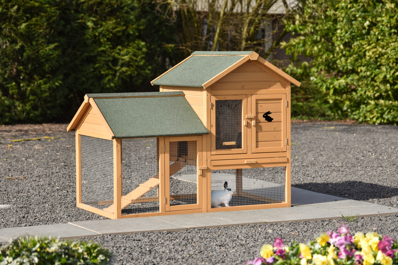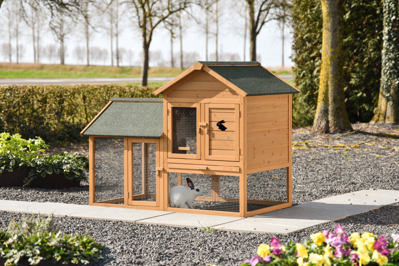 Das Dach ist mit Dachpappe versehen und bietet zusätzlichen Schutz vor Regen. Die Gittertür ist mit einer Plexiglasscheibe ausgestattet, die zusätzlichen Schutz bietet. Die Holztür mit einem schwarzen Holzkaninchen als Dekoration verleiht dem Kaninchenstall außerdem ein verspieltes und gut erkennbares Detail. Wenn Sie ein anderes Tier oder ein weißes Kaninchen wünschen, können Sie Ihre Auswahl anpassen