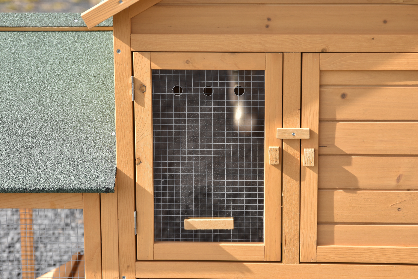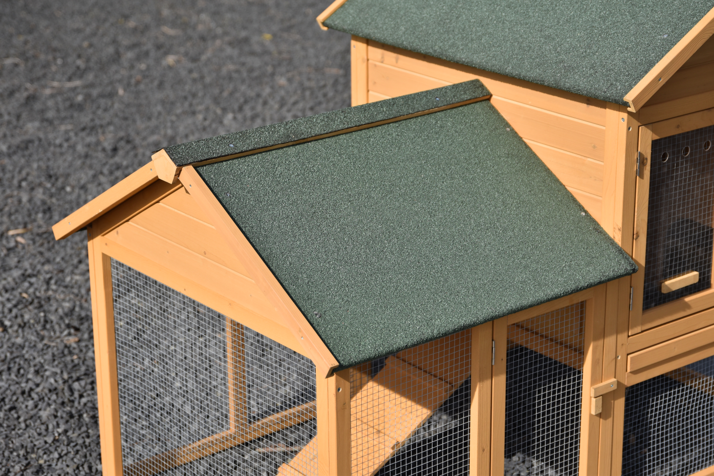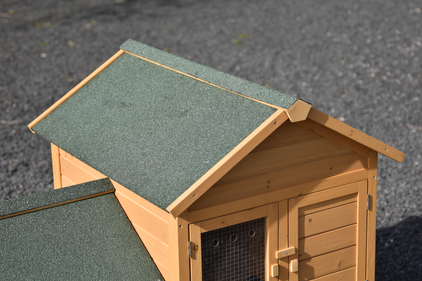 • Das Dach dieses Kaninchenstalls ist mit Dachpappe versehen.