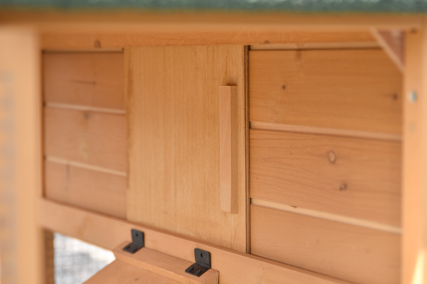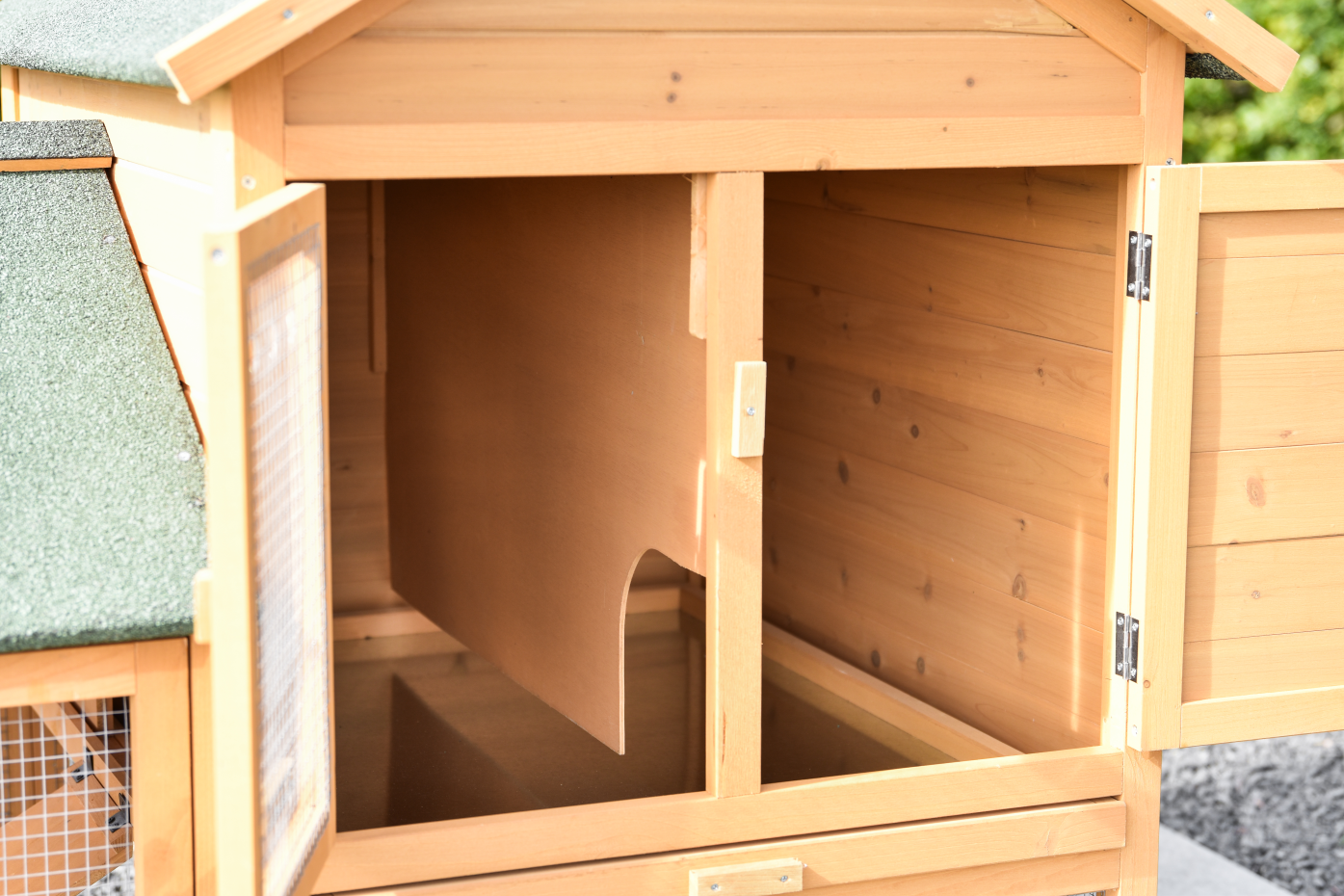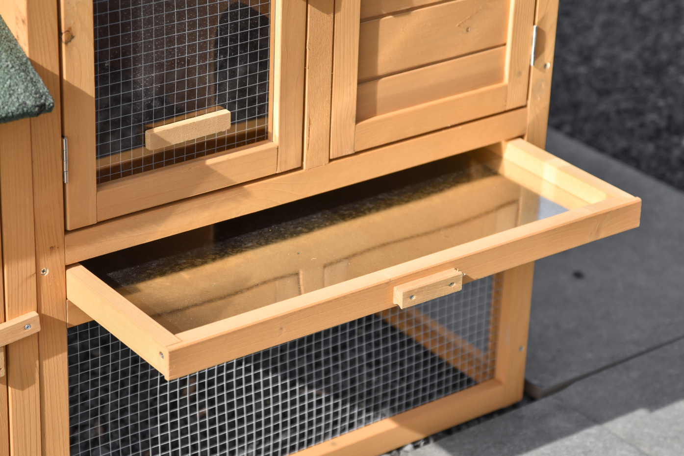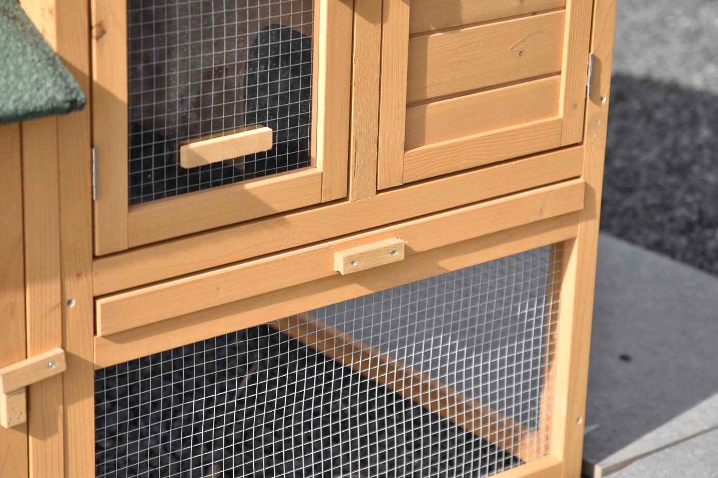 • Das Dach dieses Kaninchenstalls ist mit Dachpappe versehen.