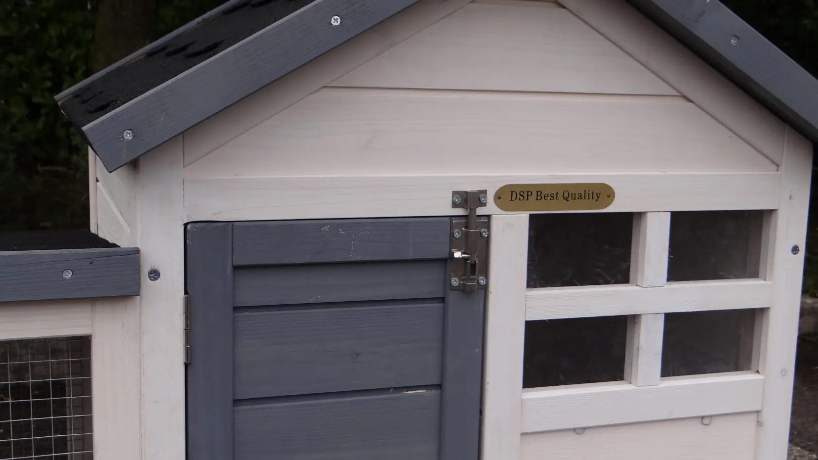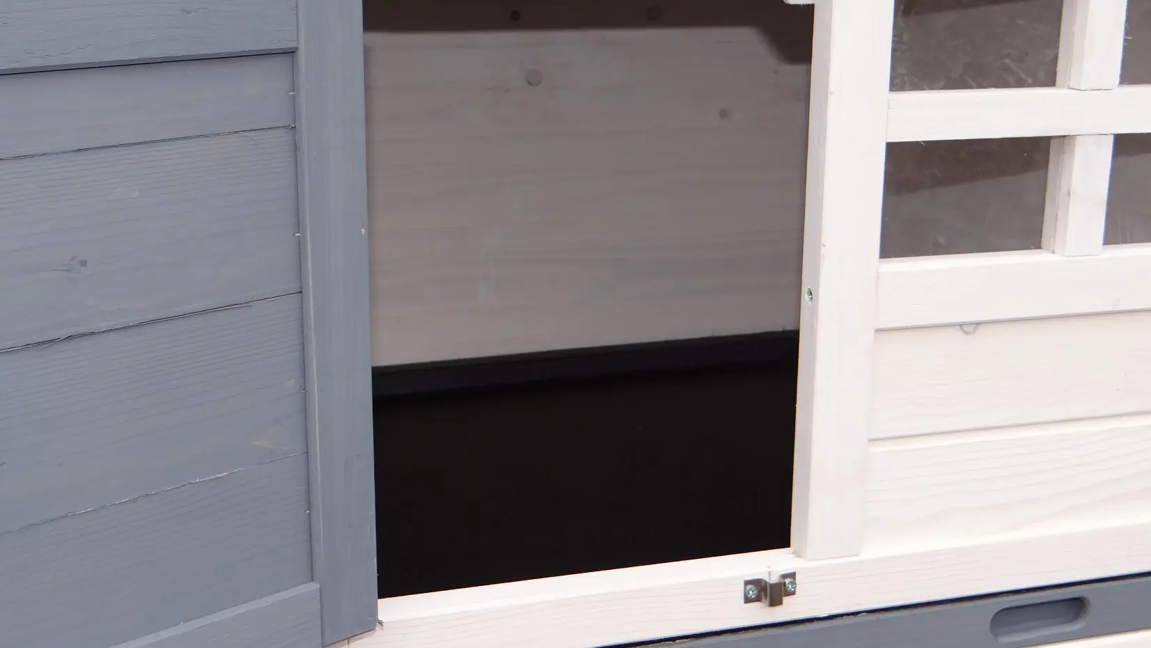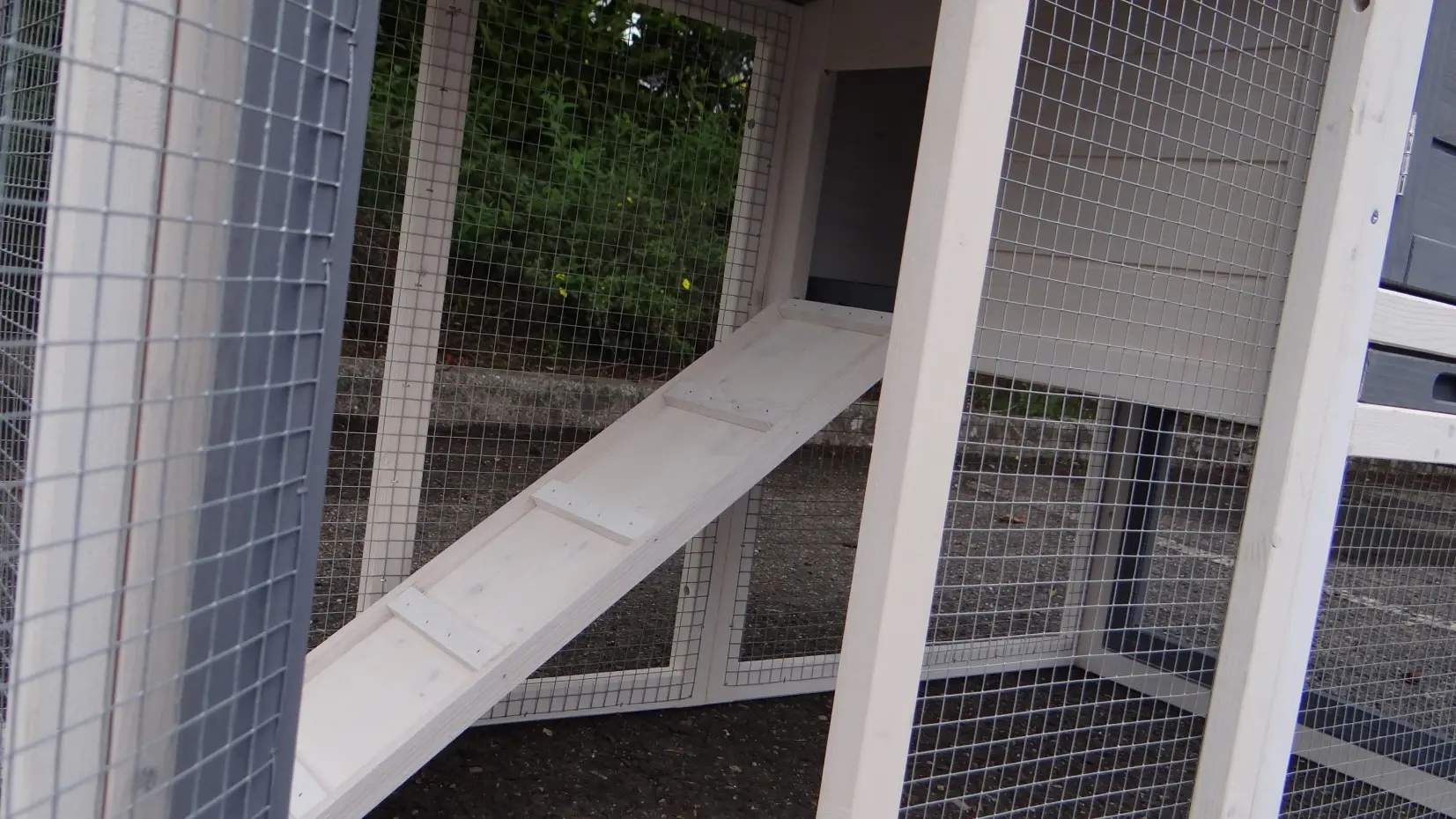 - Um diesen Stall mit einem Auslauf zu kombinieren, muss eine Tür oder ein Gitterteil entfernt werden.