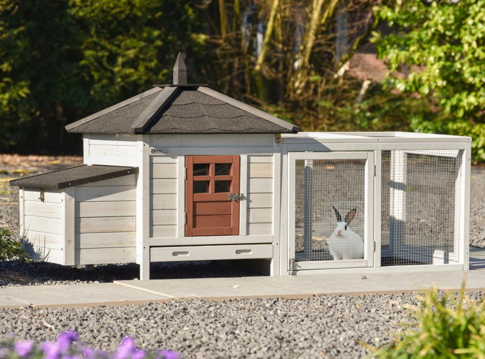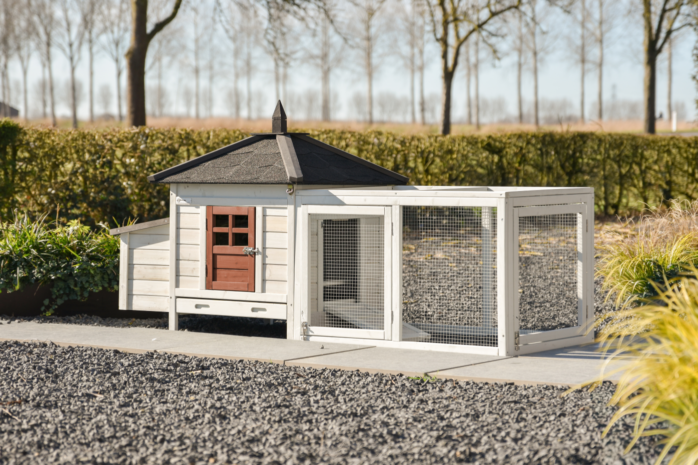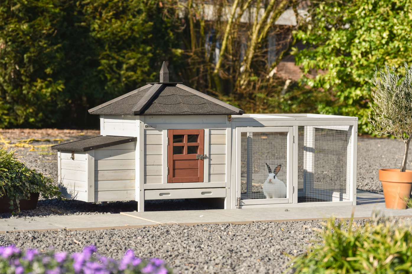 Kaninchenstall Ambiance Small mit Auslauf ist ein echter Blickfang im Garten und verbindet eine schöne Optik mit praktischem Gebrauch. Der Stall hat eine Kunststoff-Schublade, wodurch die Reinigung einfach ist. Außerdem hat der Stall ein vollständig abnehmbares Dach für zusätzlichen Zugang und eine Seitentür, die gleichzeitig als Rampe dient. Der Auslauf ist mit einem Dach aus Drahtgitter versehen