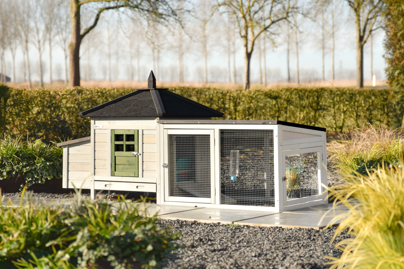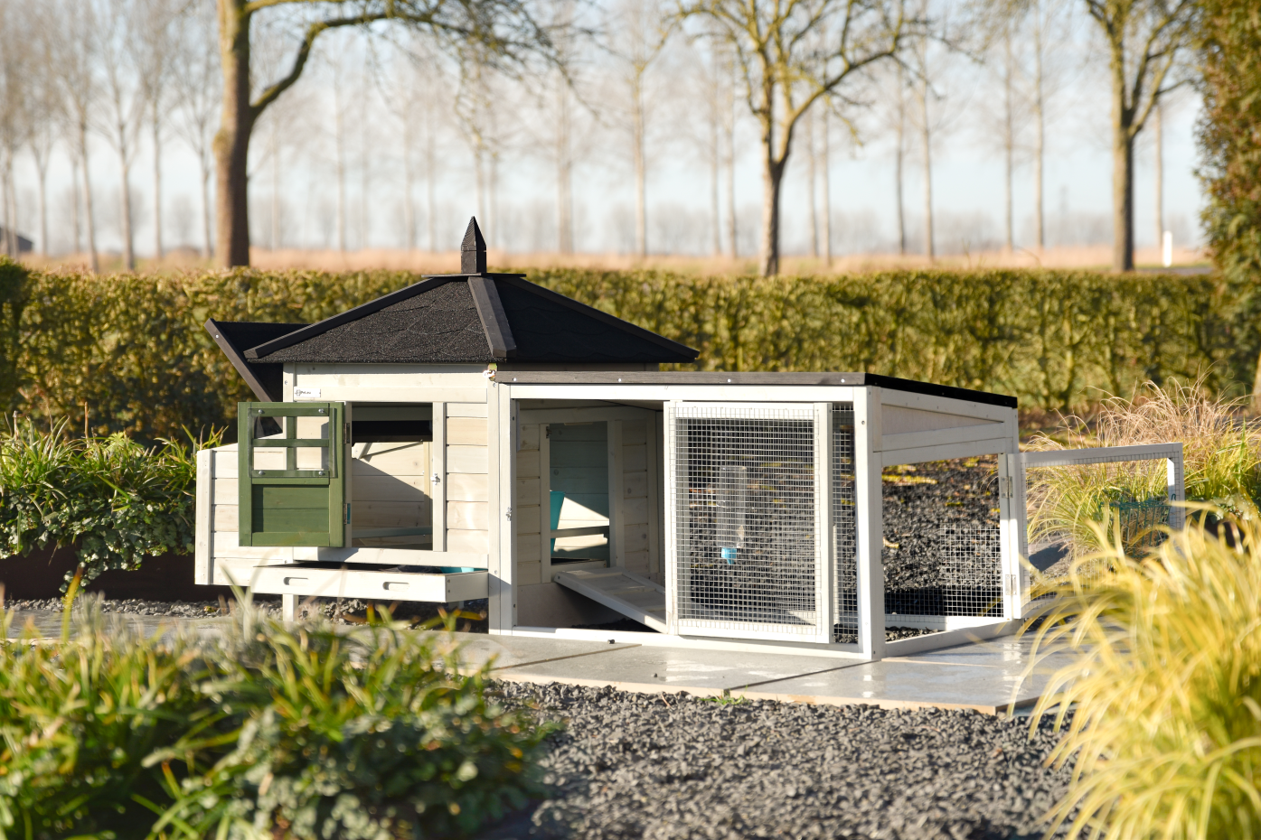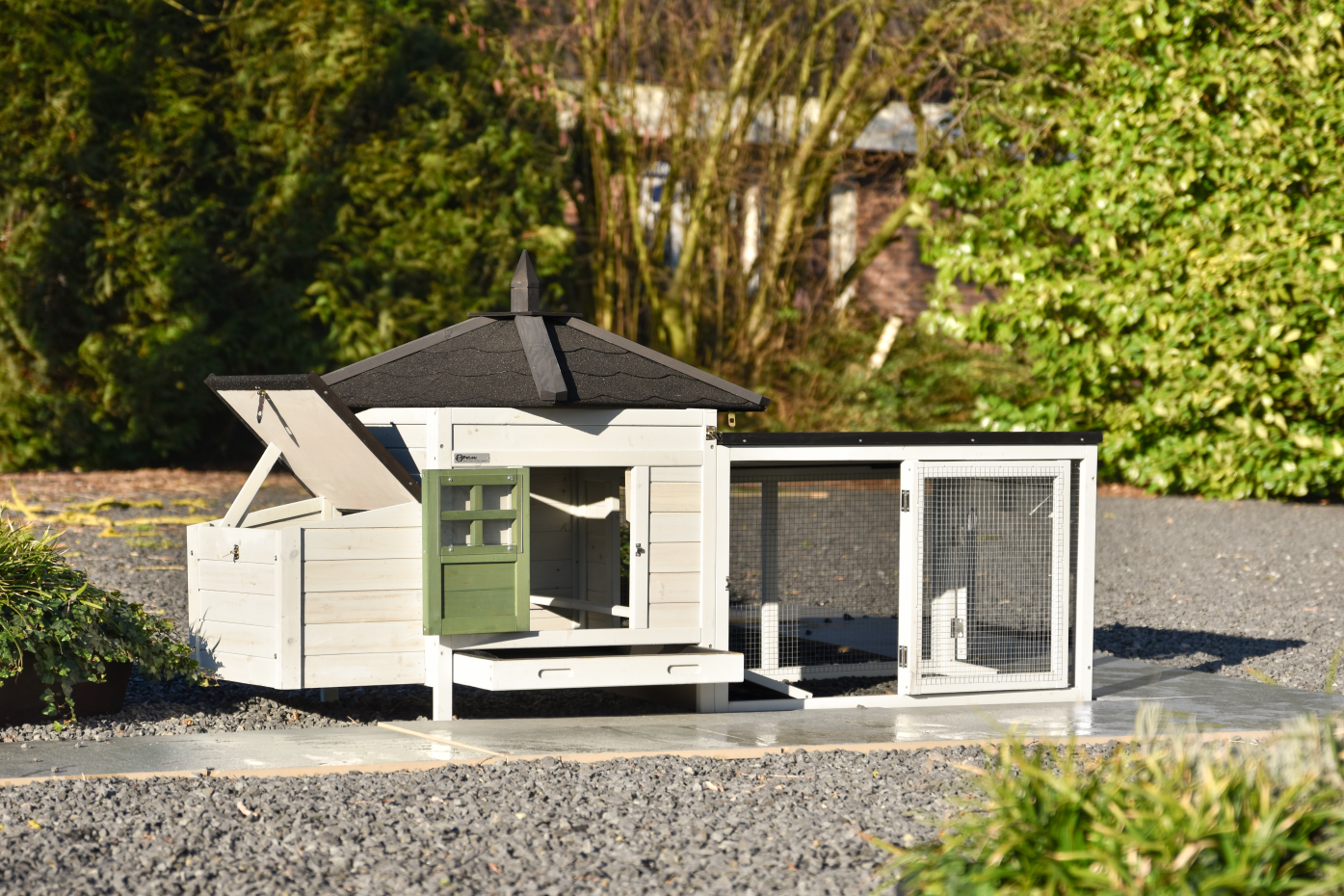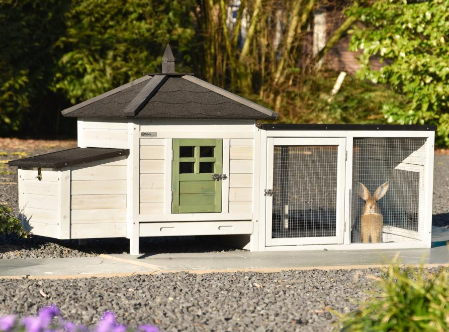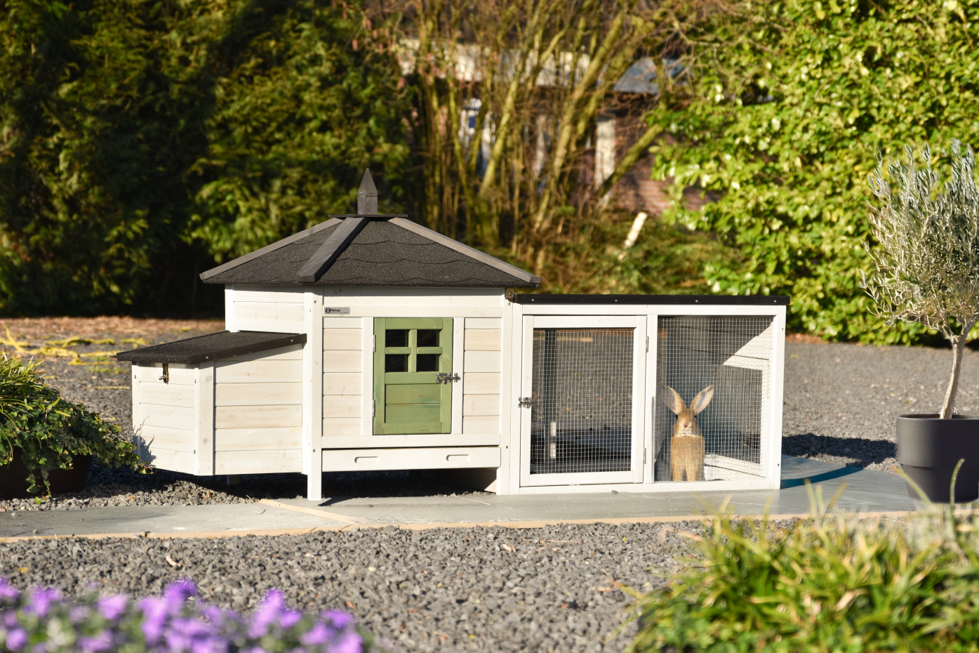 Kaninchenstall Ambiance Small mit Auslauf ist ein echter Blickfang im Garten und verbindet eine schöne Optik mit praktischem Gebrauch. Der Stall hat eine Kunststoff-Schublade für eine einfache Reinigung, ein vollständig abnehmbares Dach für zusätzlichen Zugang und eine Seitentür, die auch als Rampe dient. Der Auslauf ist mit einem Dach mit Dachpappe versehen, sodass Kaninchen auch bei Regen geschützt draußen sitzen können