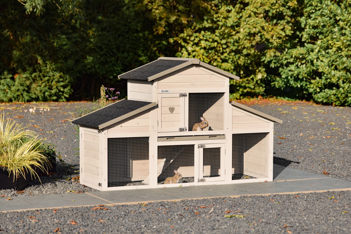 - Das Dach dieses Kaninchenstalls ist mit Dachpappe versehen.