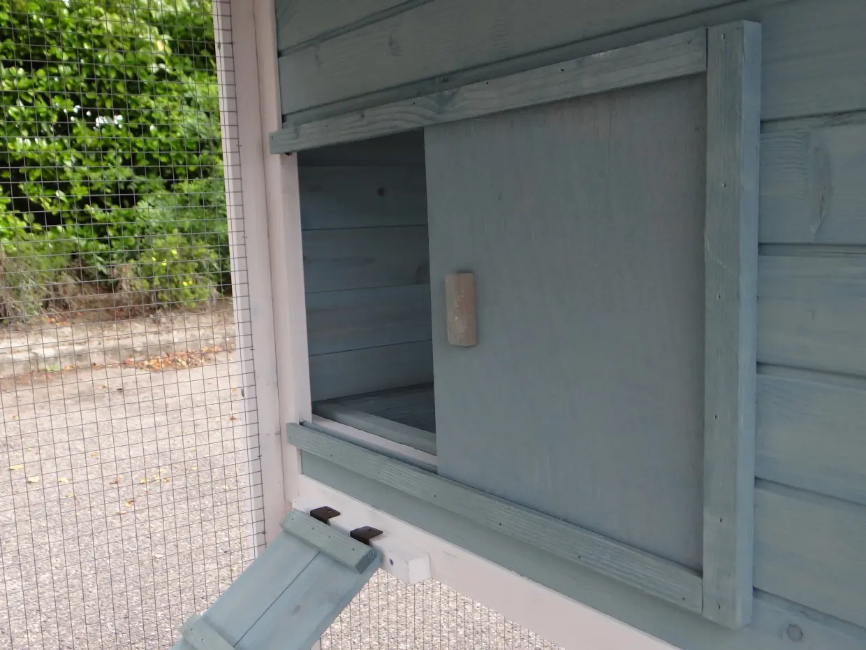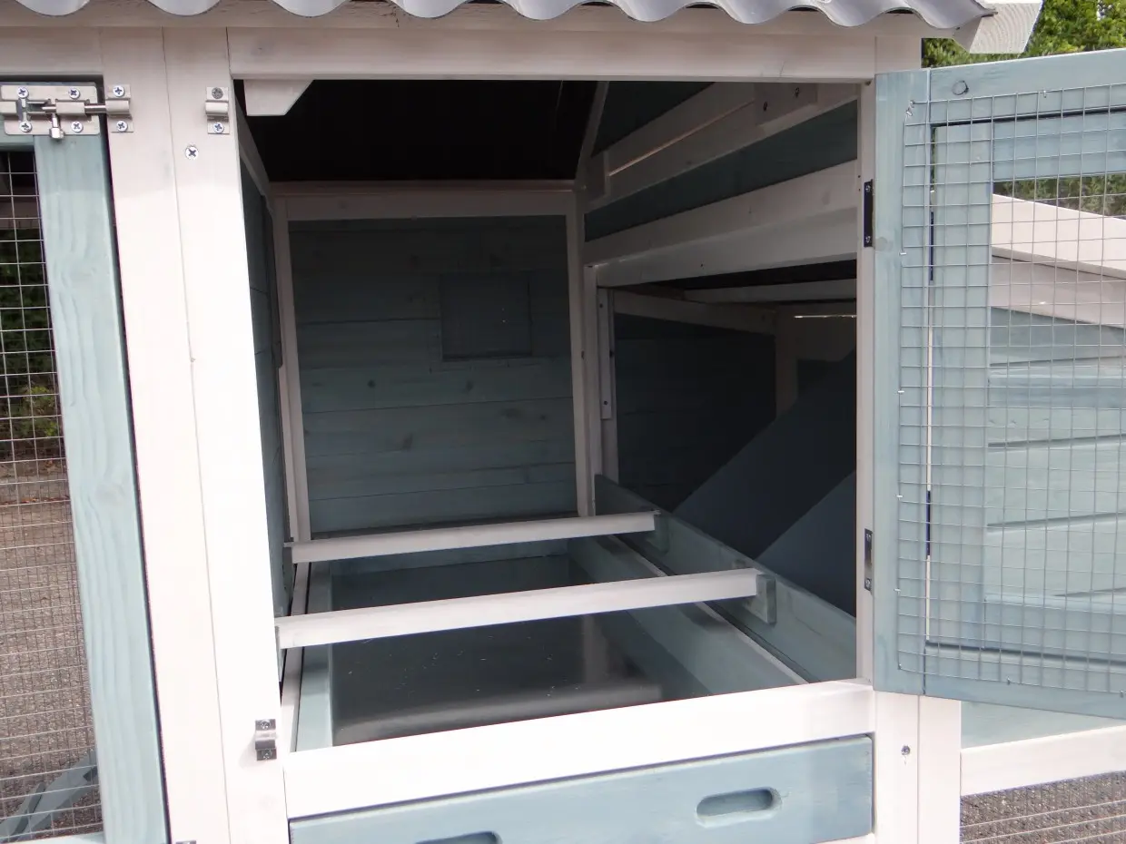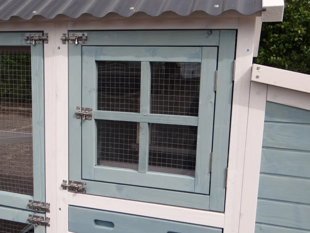 - Die Türen dieses Kaninchenstalls sind mit doppelten Schieberiegeln ausgestattet