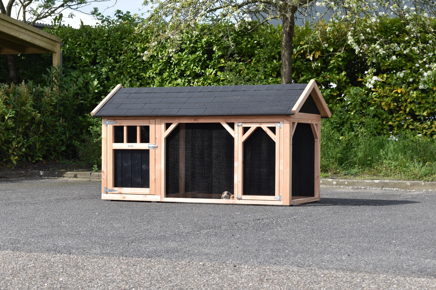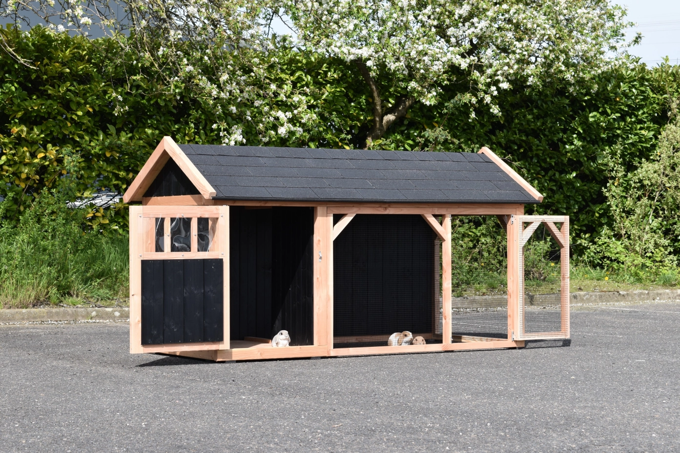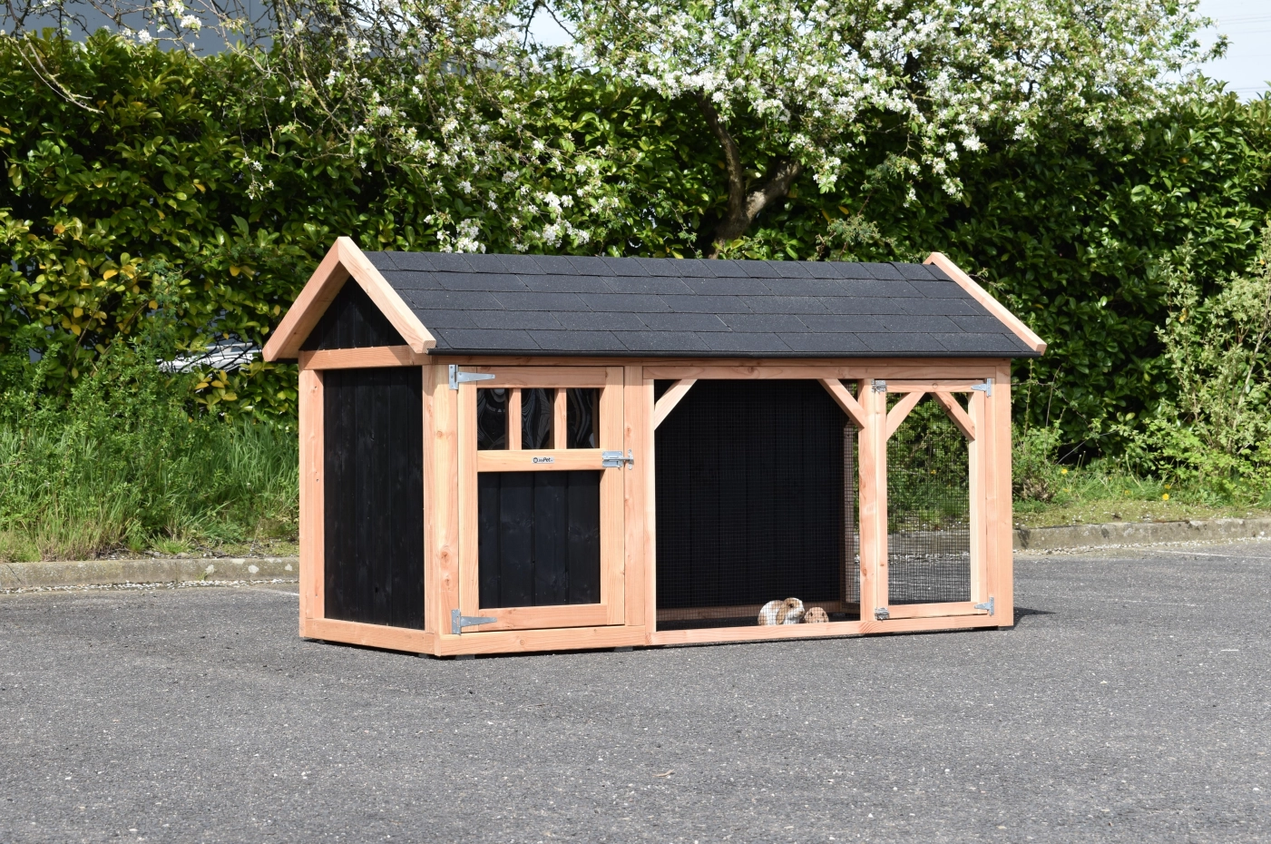 Kaninchenstall Belle 1 mit ein Spitzdach ist ein schöne Kaninchenstall mit ein überdachte Auslauf. Der Schlafraum ist ausgestat mit ein Boden aus Douglasien Holz. Wir herstellen diese Stall selbst! Durch die Verwendung von hochwertiger Materialien ist sie sehr wartungsfrei.