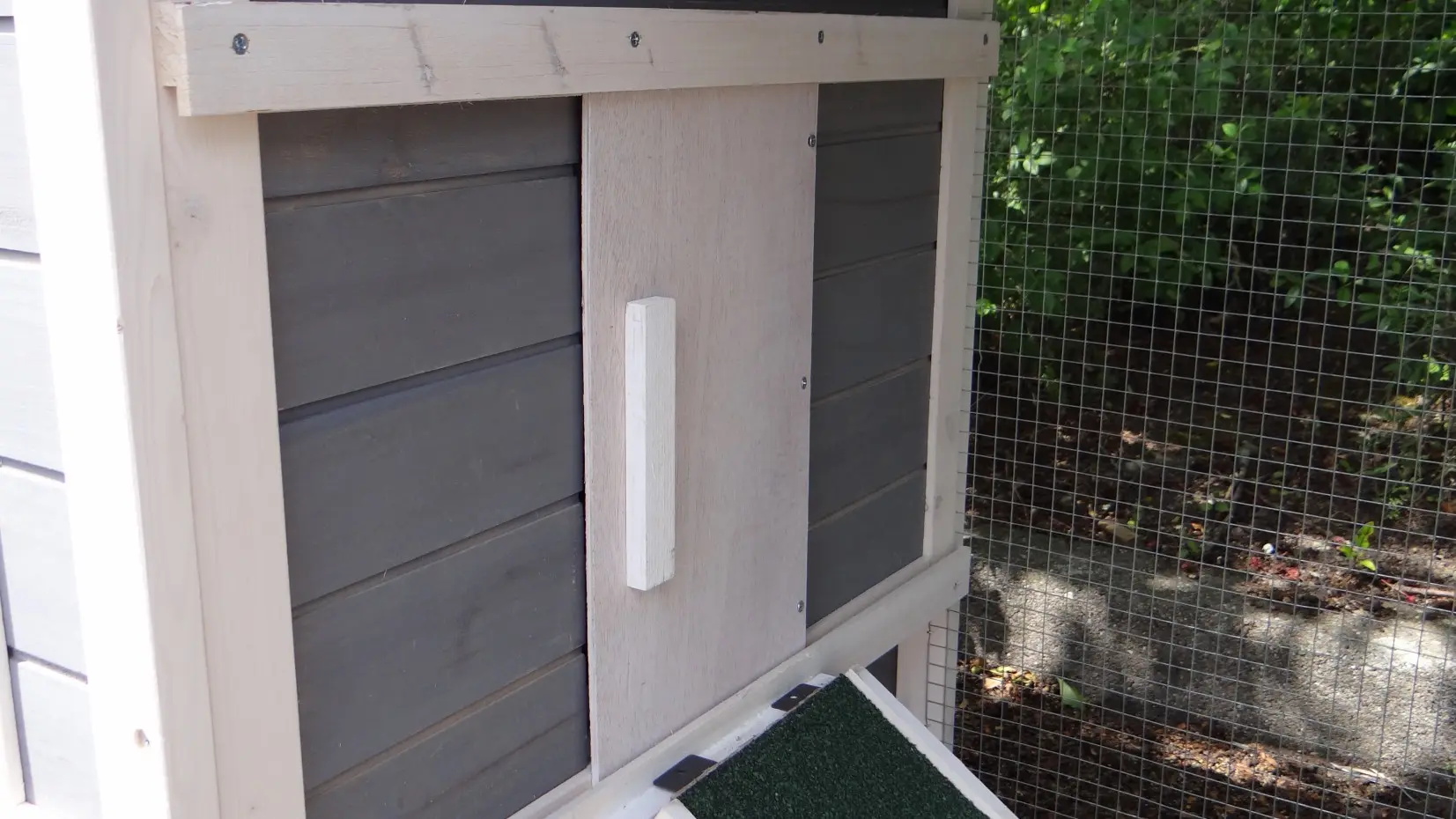 - Die Türen dieses Kaninchenstalls sind mit doppelten Schieberiegeln ausgestattet
