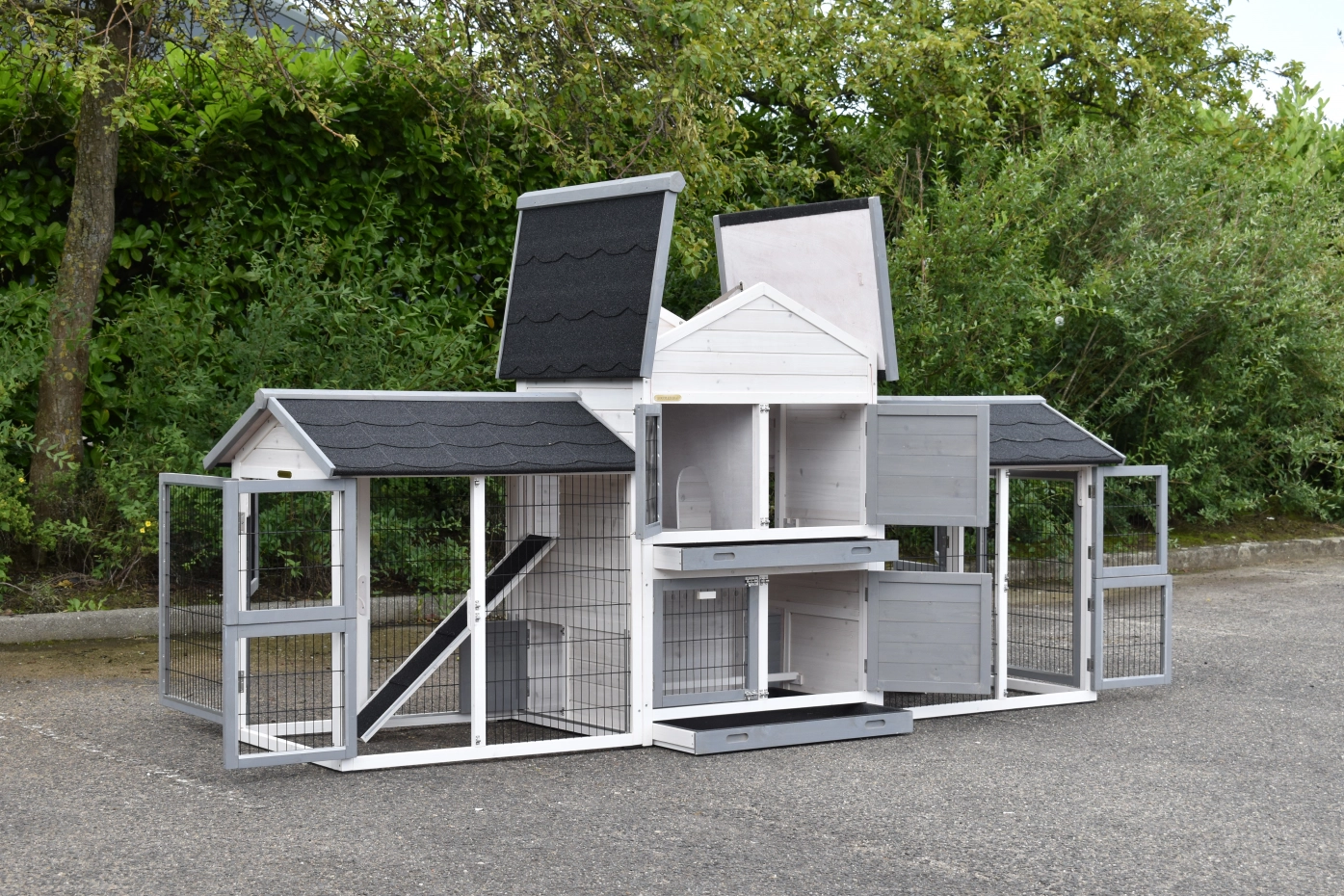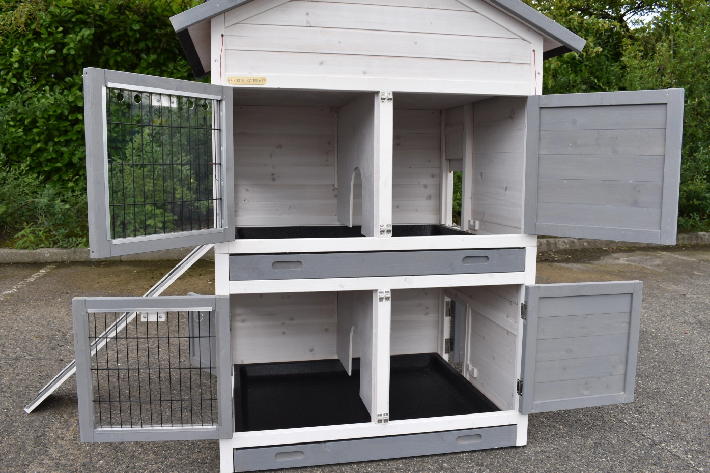 - Der Kaninchenstall besitzt eine praktische, herausziehbare Kotwanne.