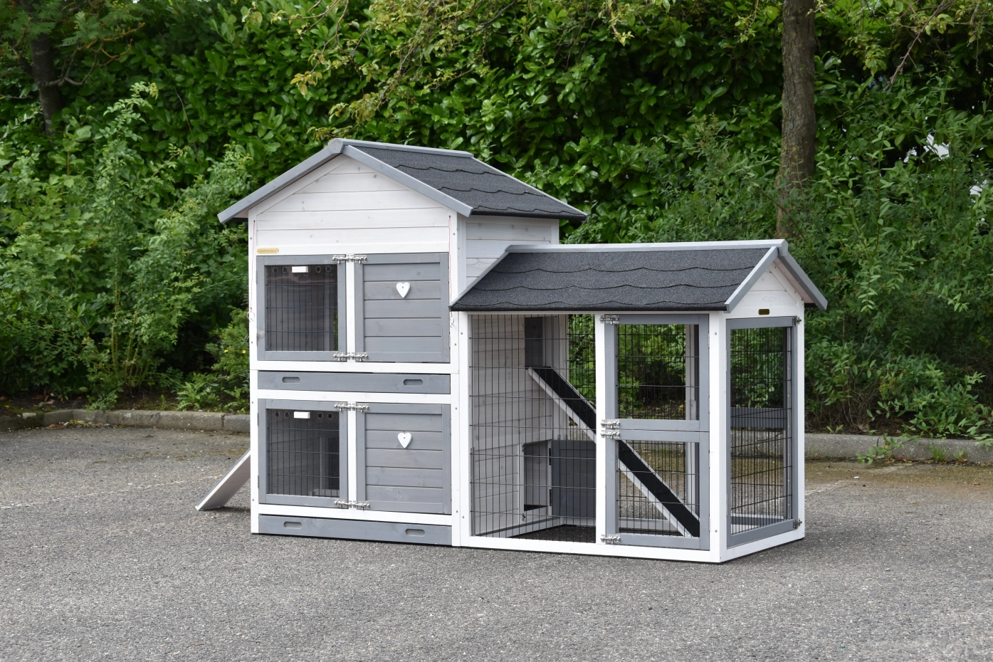 Kaninchenstall Double Medium mit rechtem Auslauf ist ein praktischer Stall mit abschließbaren Schlafräume, ideal für mehrere Kaninchen. Die geräumigen Türen sind knabbersicher, und die Schlafkräume können separat verschlossen werden. Mit diesem Kaninchenstall können Sie selbst entscheiden, ob Ihre Kaninchen zusammenbleiben dürfen oder getrennt werden sollen.