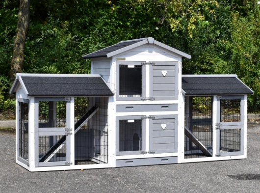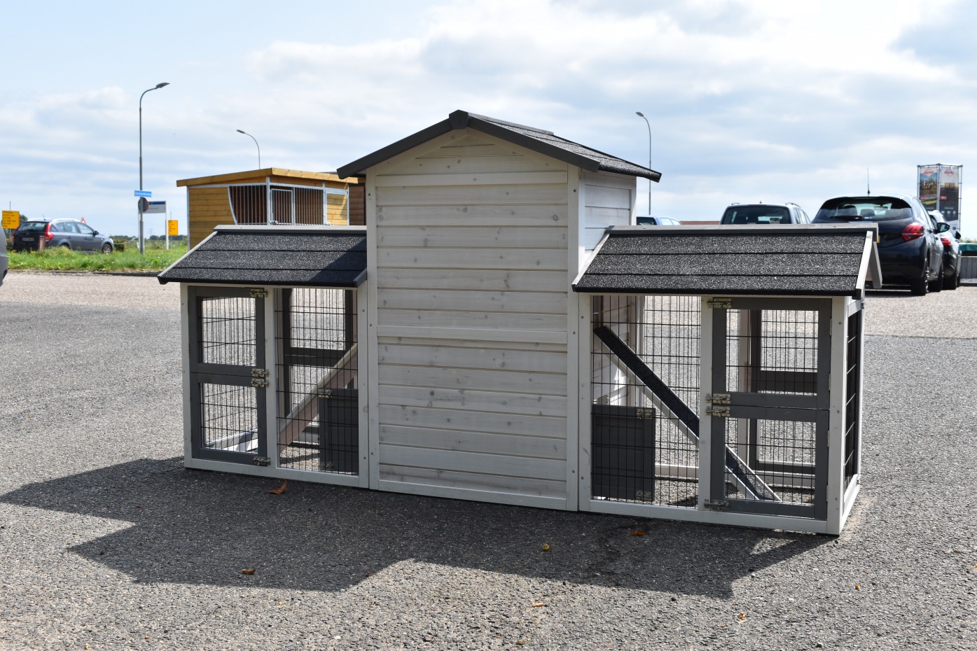 Der schöne Kaninchenstall Double Small hat 2 abschließbare Schlafräume. Der Stall hat große Türen und 2 Schubladen, so dass der Stall leicht zu reinigen ist. Diese Stall bietet der Möglichkeit um mehrere Tiere separat zu halten. Der Stall ist ausgestattet mit ein Klappdach und ein praktisch Stauraum. Der Stall ist geeignet für 2 bis 4 Kaninchen.