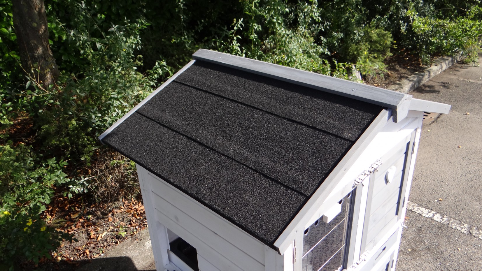 - Das Dach dieses Kaninchenstalls ist mit Dachpappe versehen.