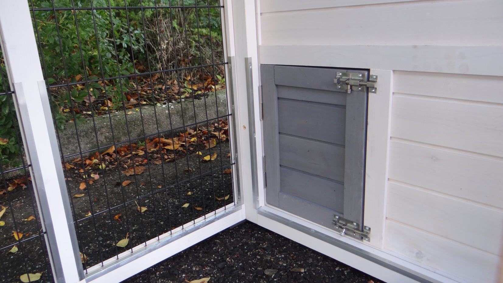 - Um diesen Stall mit einem Auslauf zu kombinieren, muss eine Tür oder ein Gitterteil entfernt werden.