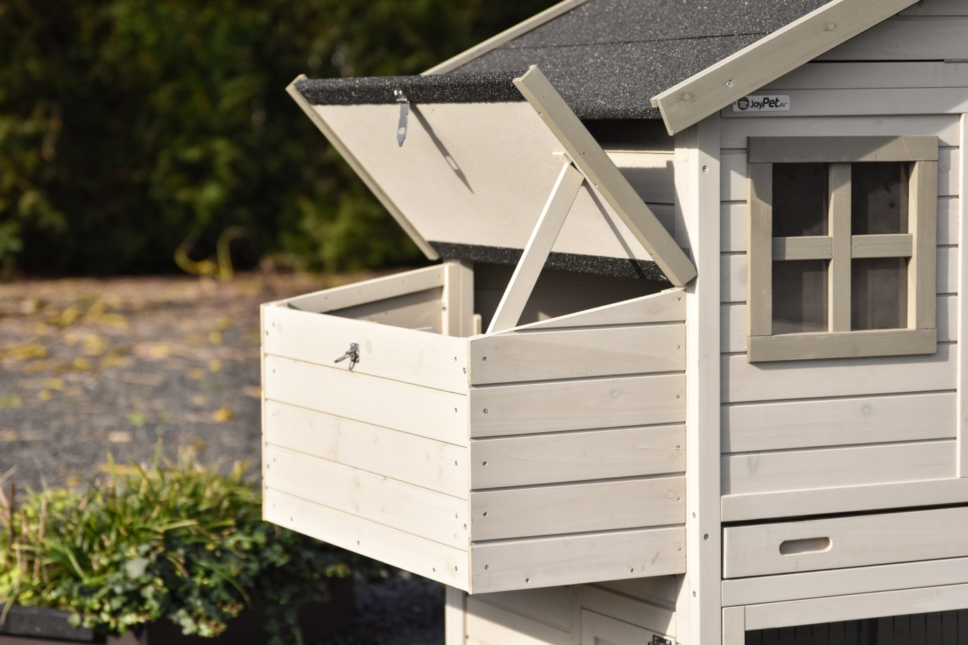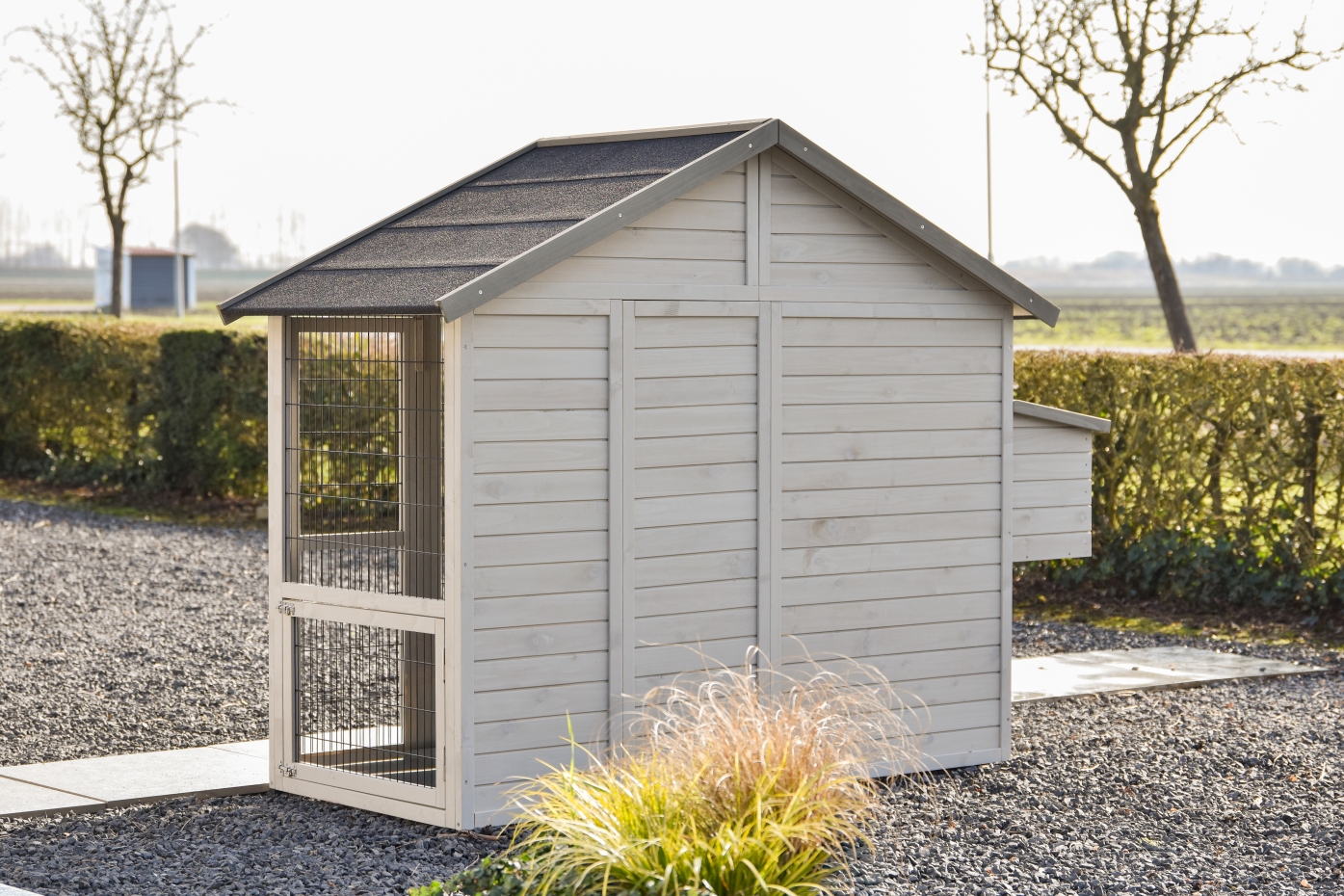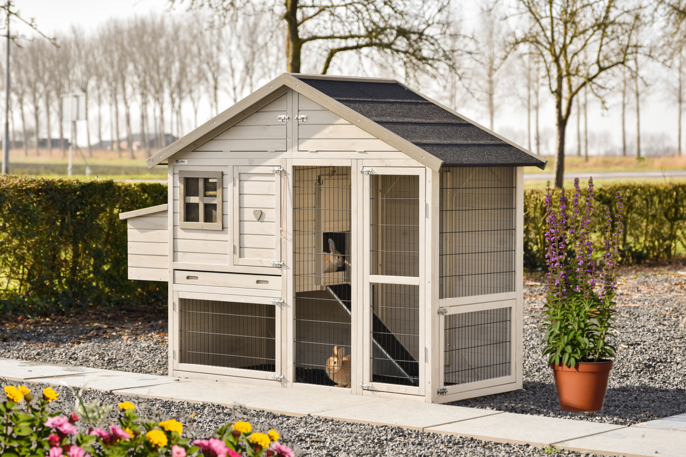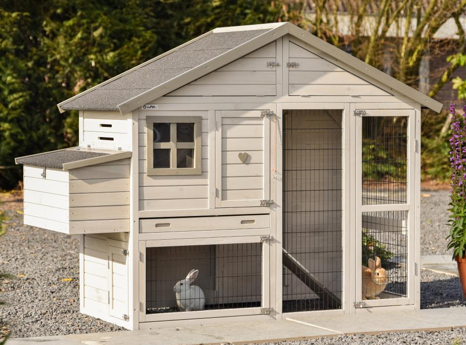 Der Kaninchenstall Holiday medium ist ein geräumiger und praktischer Stall in der Farbe Light-Grey mit mehreren Türen, sodass Füttern, Reinigen und Versorgen besonders einfach bleibt; diese mittlere Größe der Holiday-Serie bietet Kaninchen komfortablen Lebensraum, verfügt über einen praktischen Dachboden zur Aufbewahrung von beispielsweise Futter oder Zubehör, besitzt einen angebauten Nistkasten für zusätzlichen Platz im Schlafbereich und kann vollständig mit verschiedenen Ausläufen erweitert werden, sodass der Stall mitwachsen und an den verfügbaren Platz im Garten angepasst werden kann.