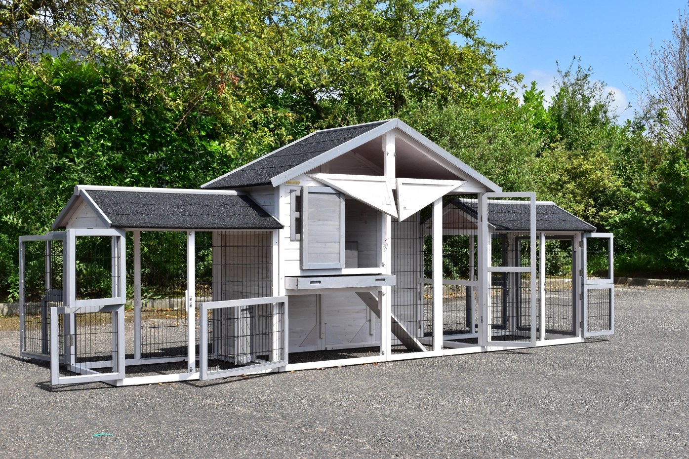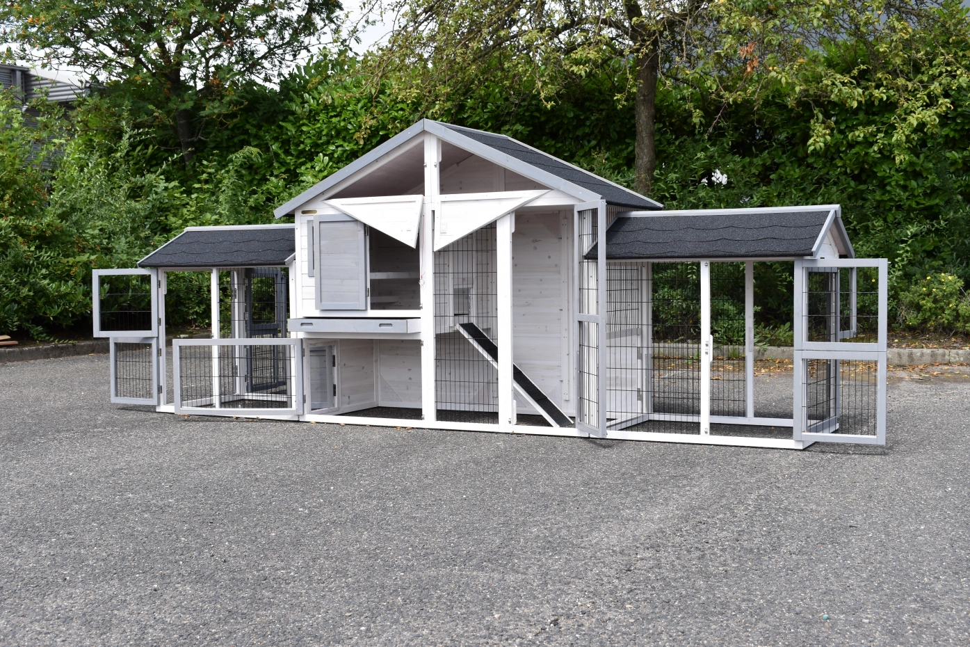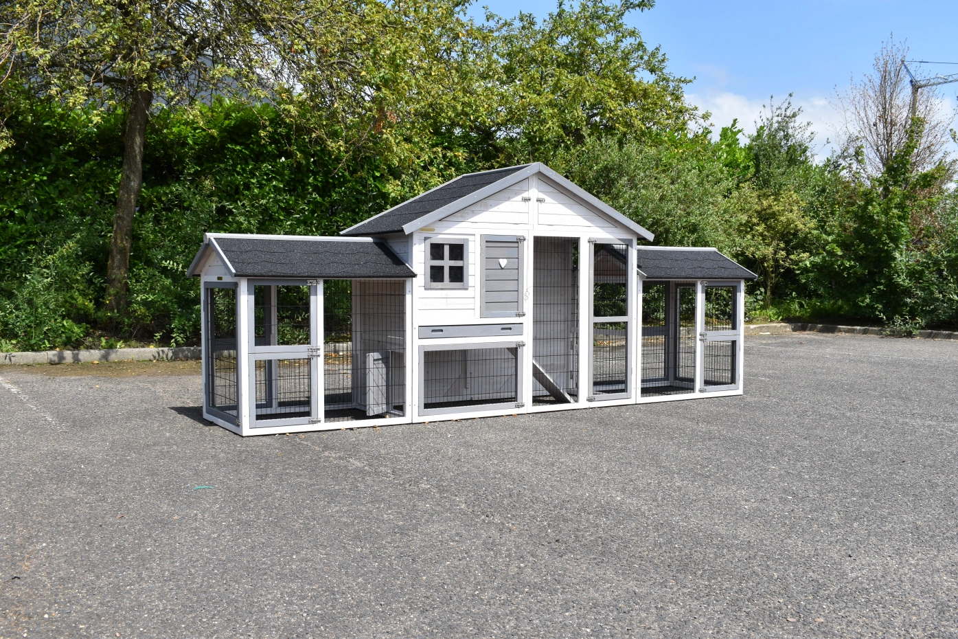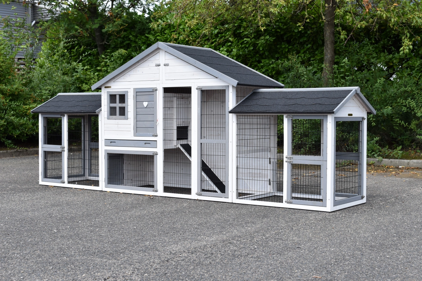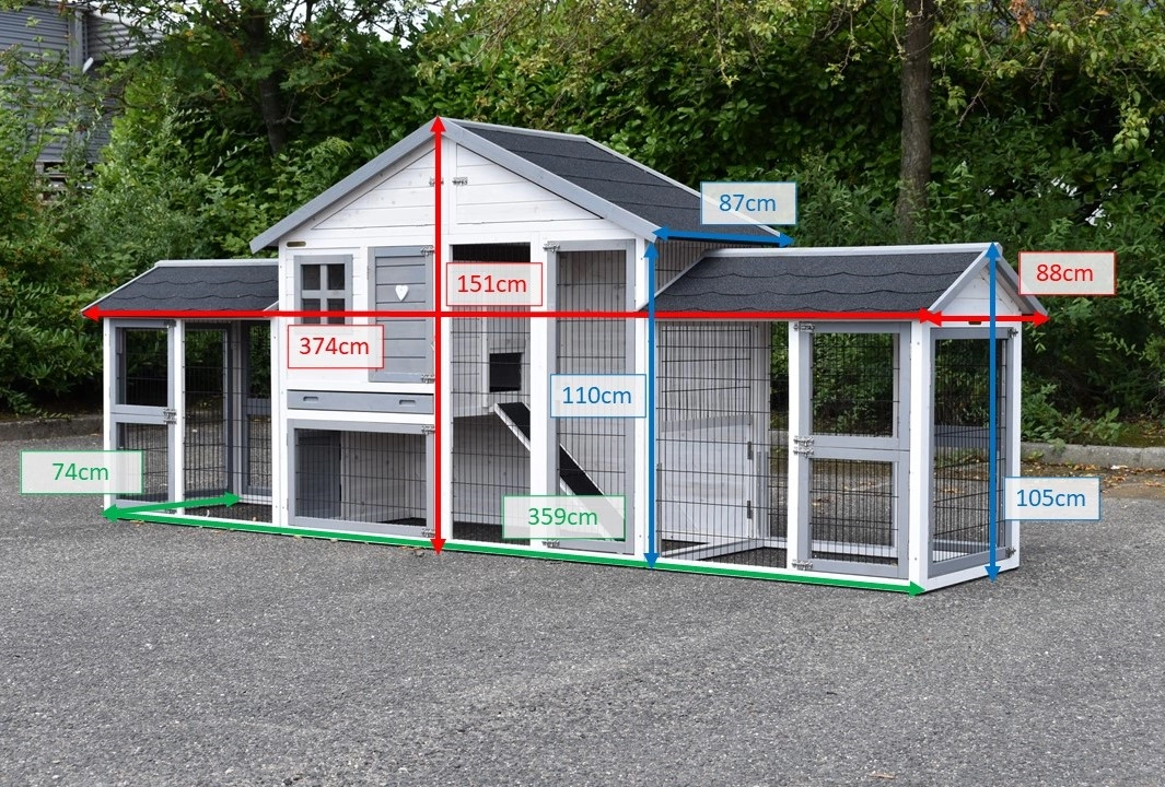 Der Kaninchenstall Holiday Medium Weiß-Grau mit 2 angebauten Gehegen ist ein geräumiger, praktischer und schöner Kaninchenstall mit einem Schlafbereich und großzügigem Auslauf. Geeignet für große Kaninchen wie den französischen Widder, den Flämischen Riesen und andere große Rassen oder eine Gruppe von Kaninchen. Der Stall verfügt über eine Schublade und einen praktischen Dachboden.