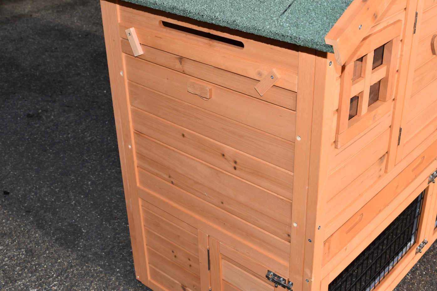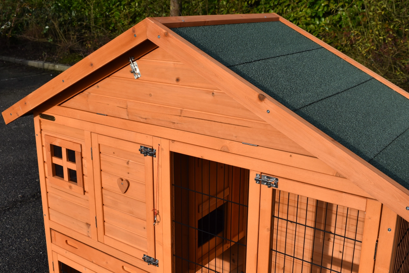 • Das Dach dieses Kaninchenstalls ist mit Dachpappe versehen.