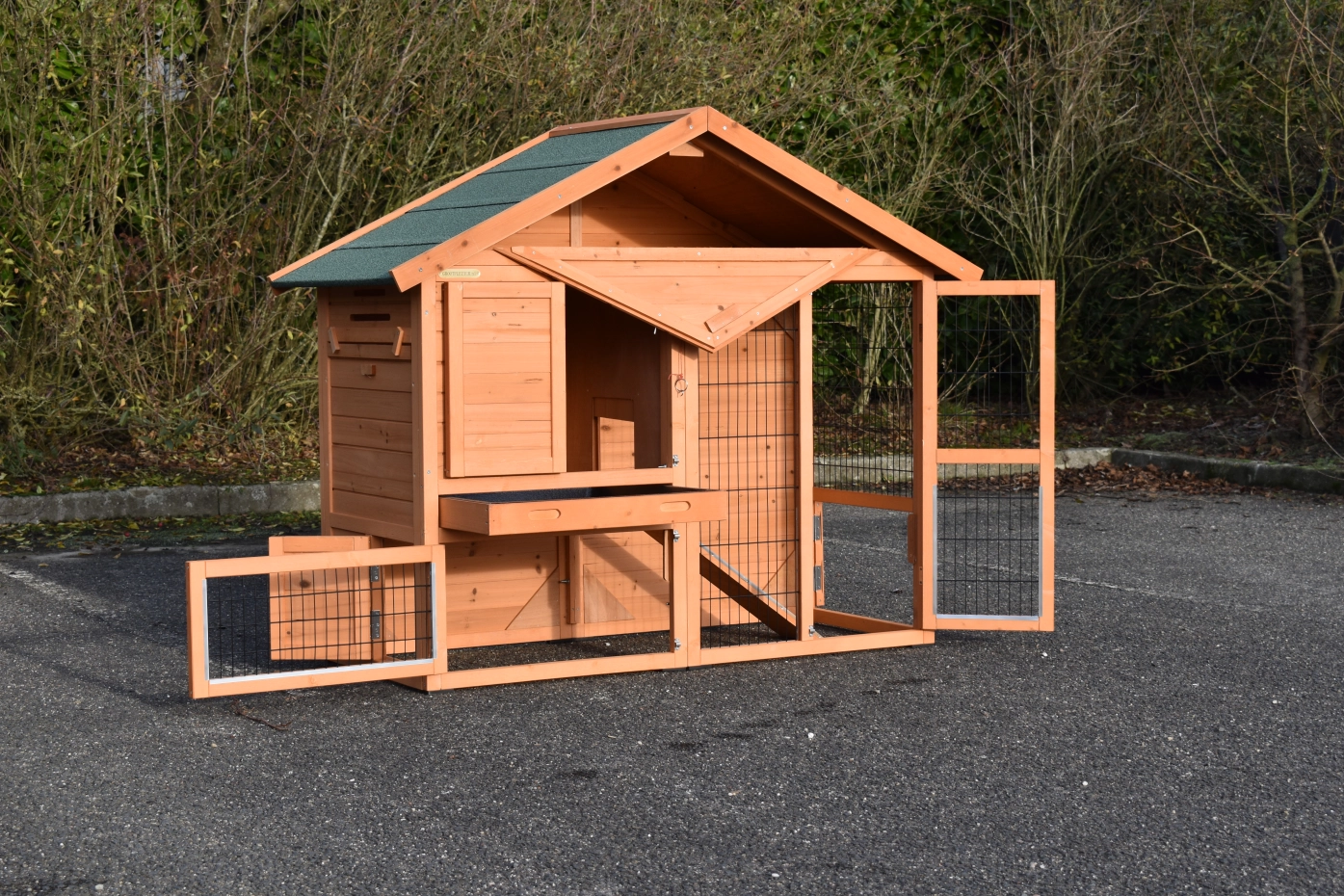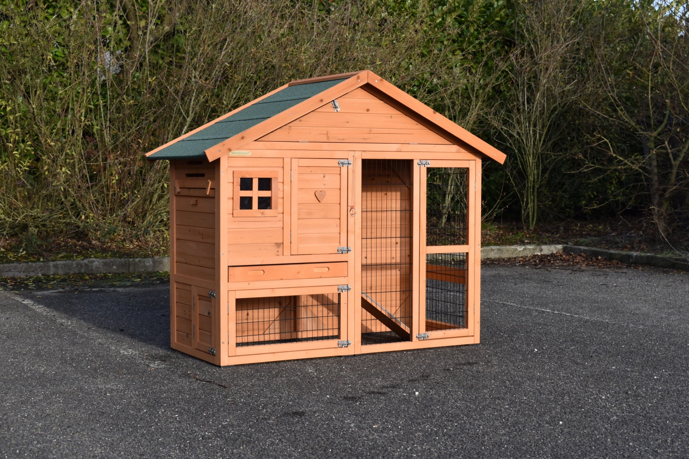 Kaninchenstall Holiday Small ist ein praktische Stall. Der kaninchenstall ist ausgestattet mit Nageschutzstreifen, so dass der Kaninchen nicht einfach an das Holz können nagen. Dieser Stall hat große Türen mit Doppelschlösser. Dieser Stall hat gummi Füßen. Dieser Kaninchenstall hat ein tiefe Schublade, um der Schlafraum einfach zu können reinigen, und ein praktisch Stauraum. Das Dach ist ausgestattet mit grüne Dachpappe.