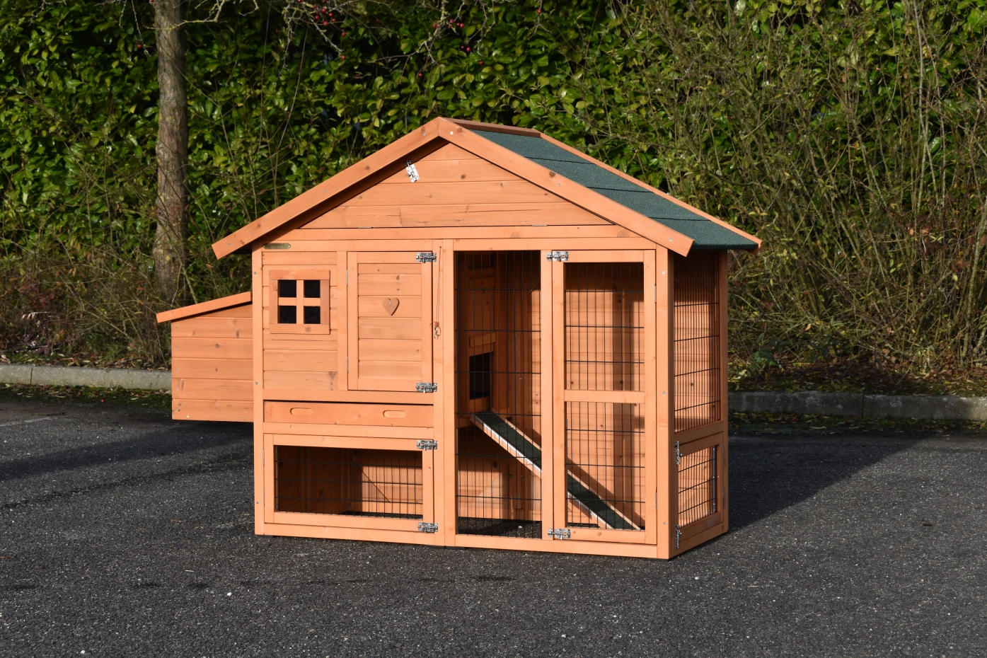 - Das Dach dieses Kaninchenstalls ist mit Dachpappe versehen.