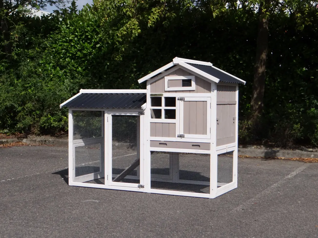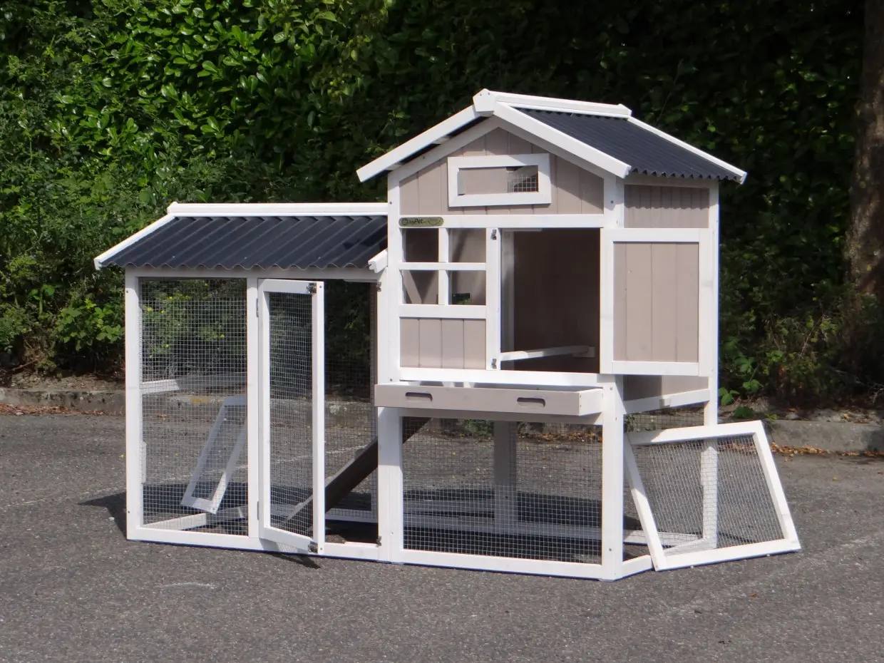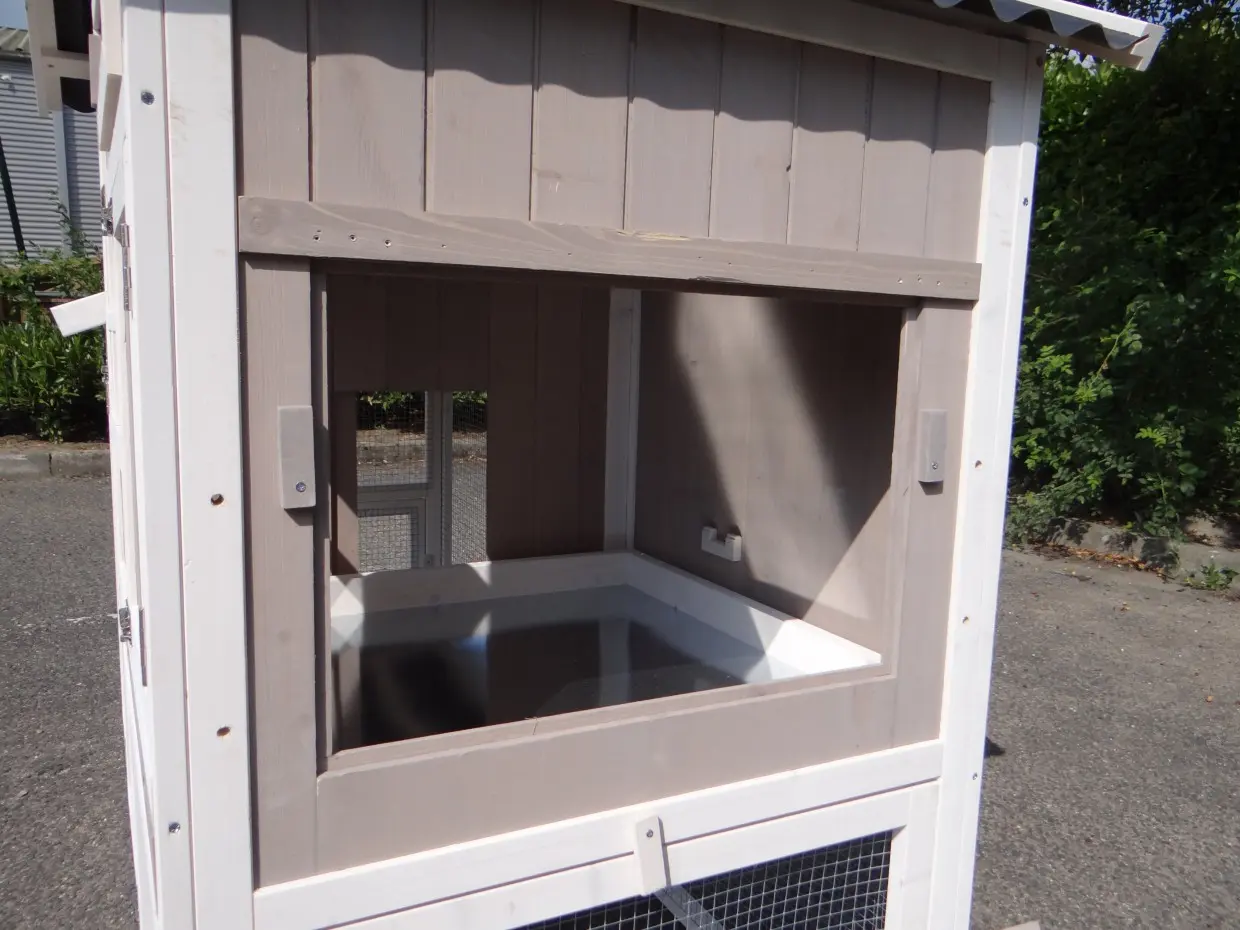 - Das Dach dieses Kaninchenstalls ist von Kunststof.