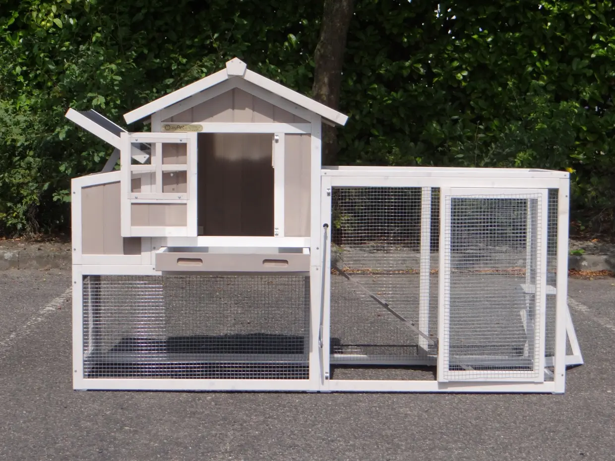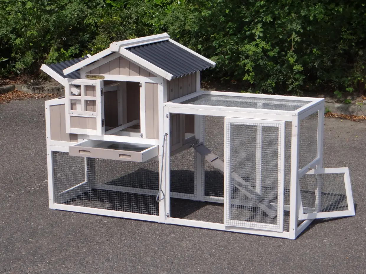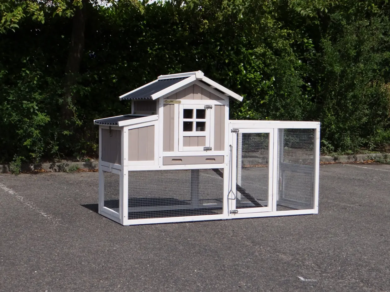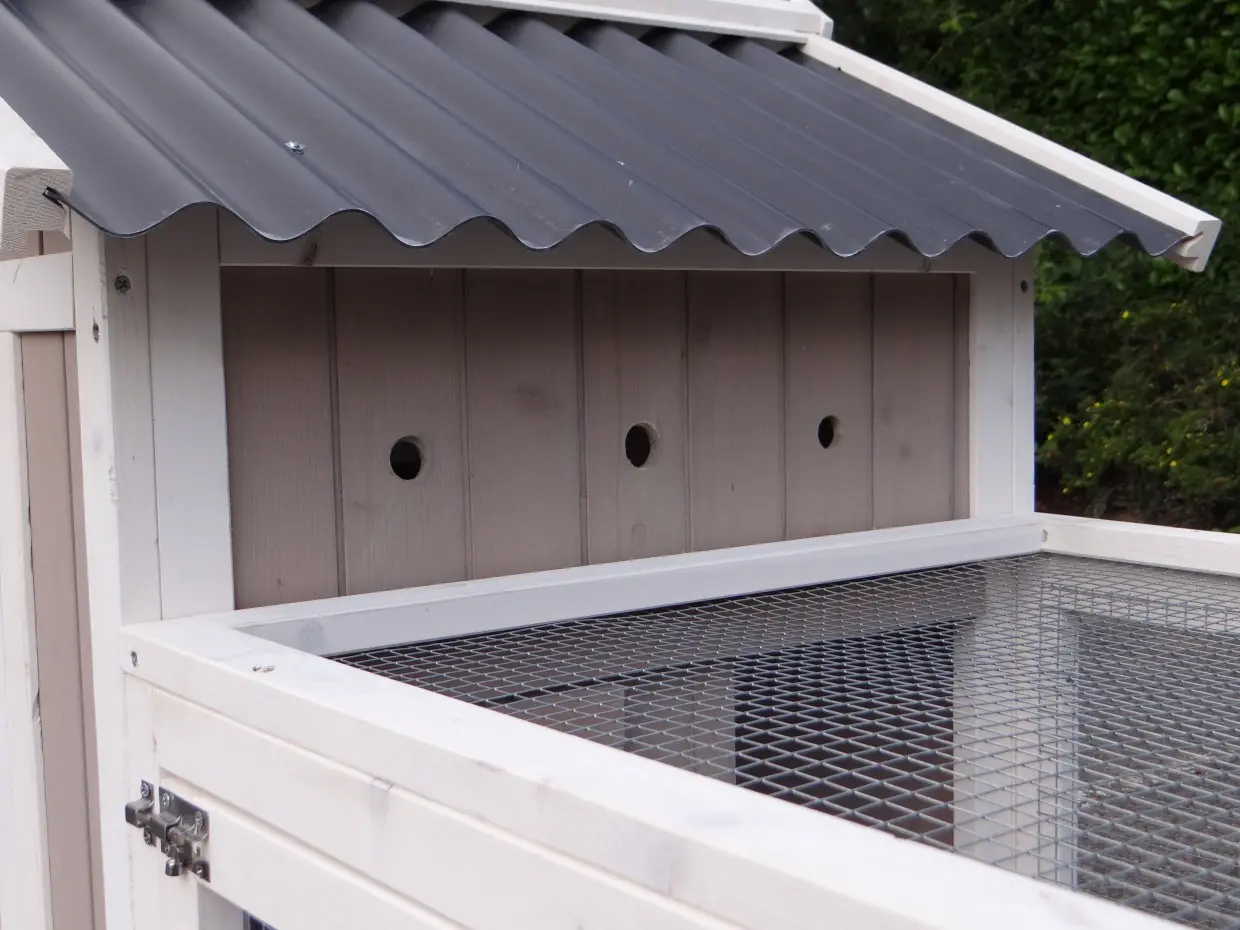• Das Dach dieses Kaninchenstalls ist von Kunststof.