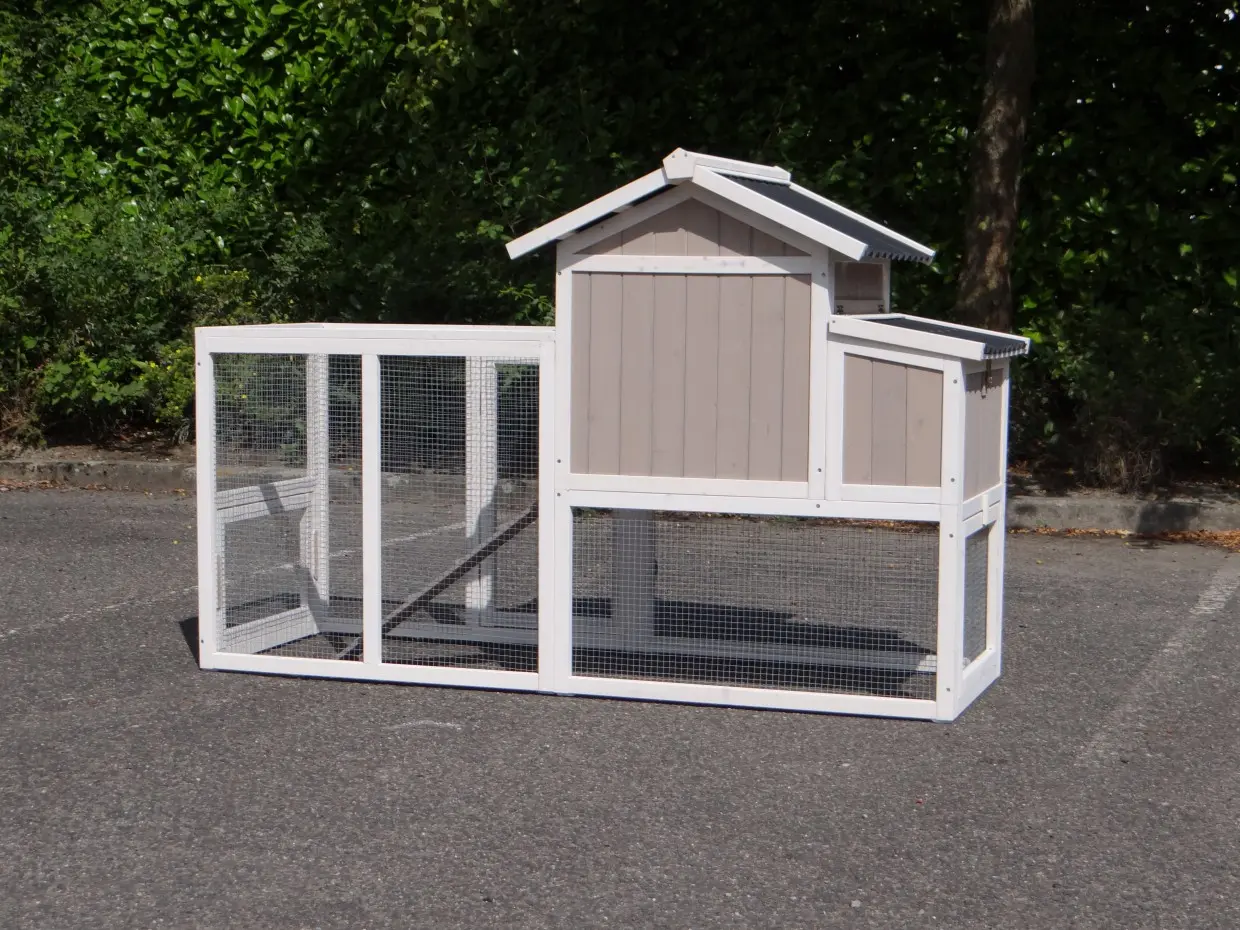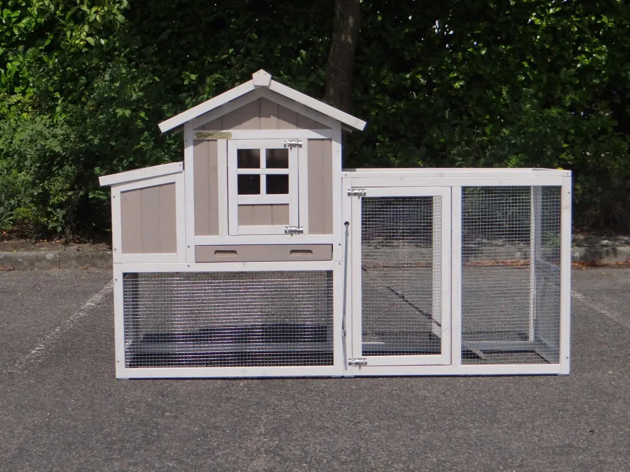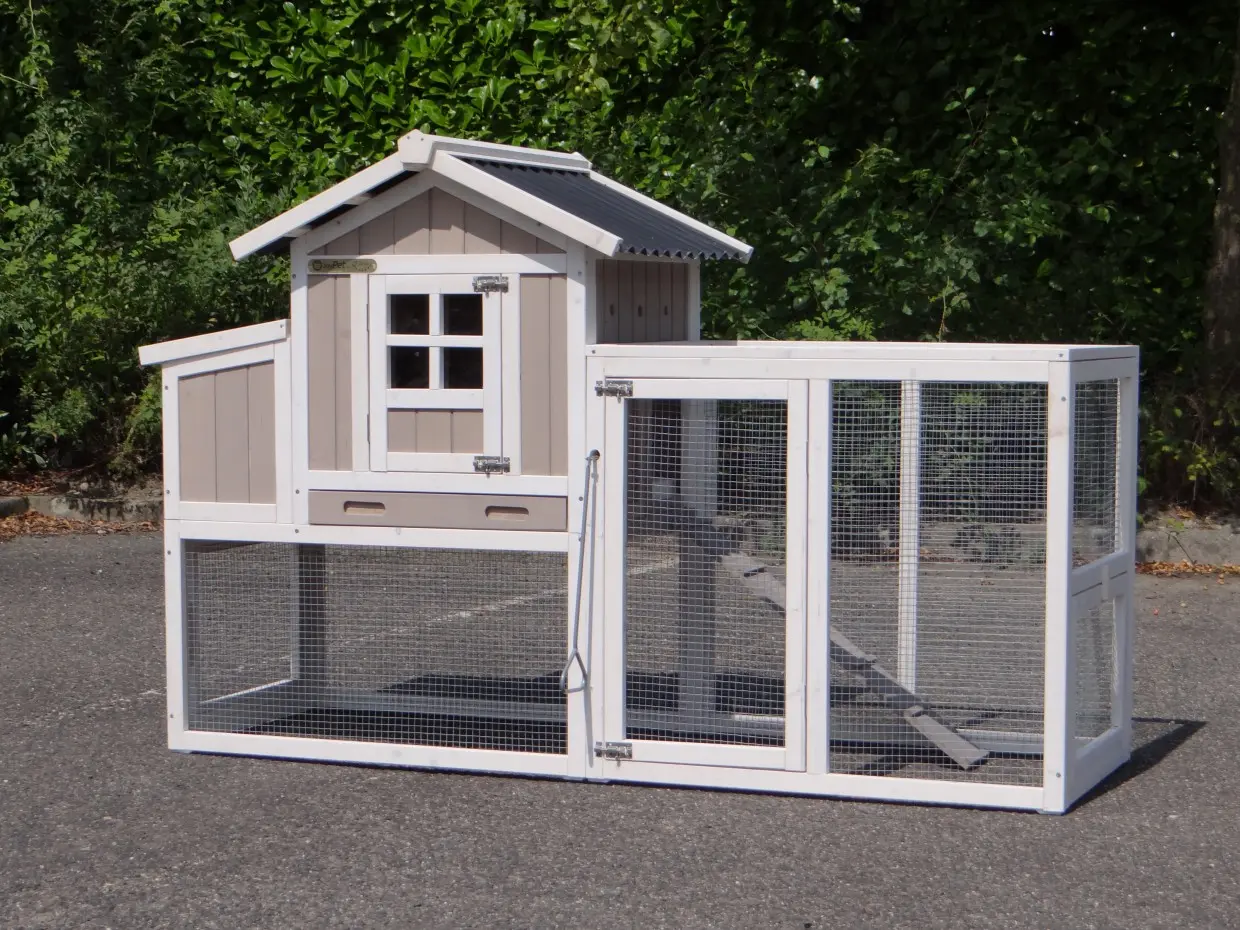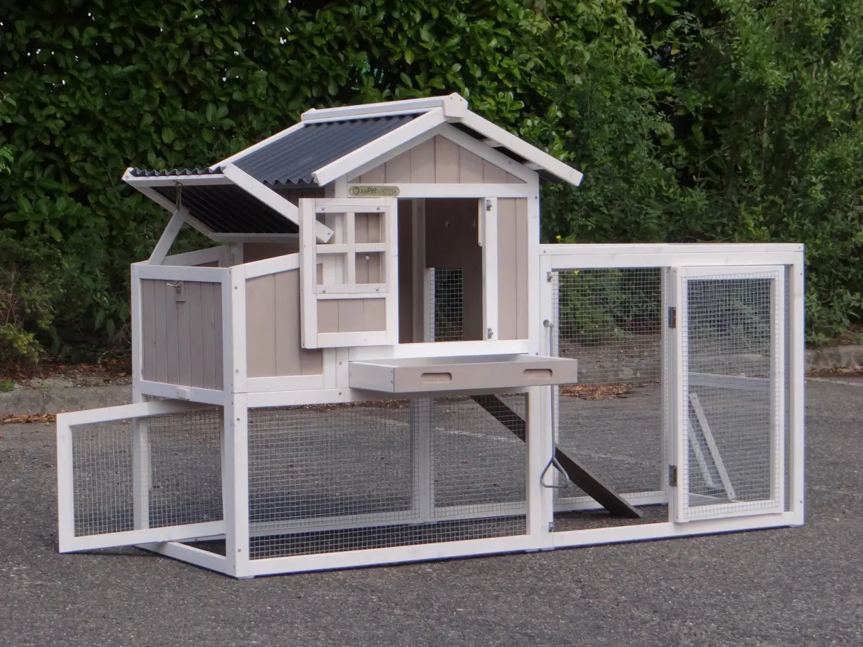 • Das Dach dieses Kaninchenstalls ist von Kunststof.