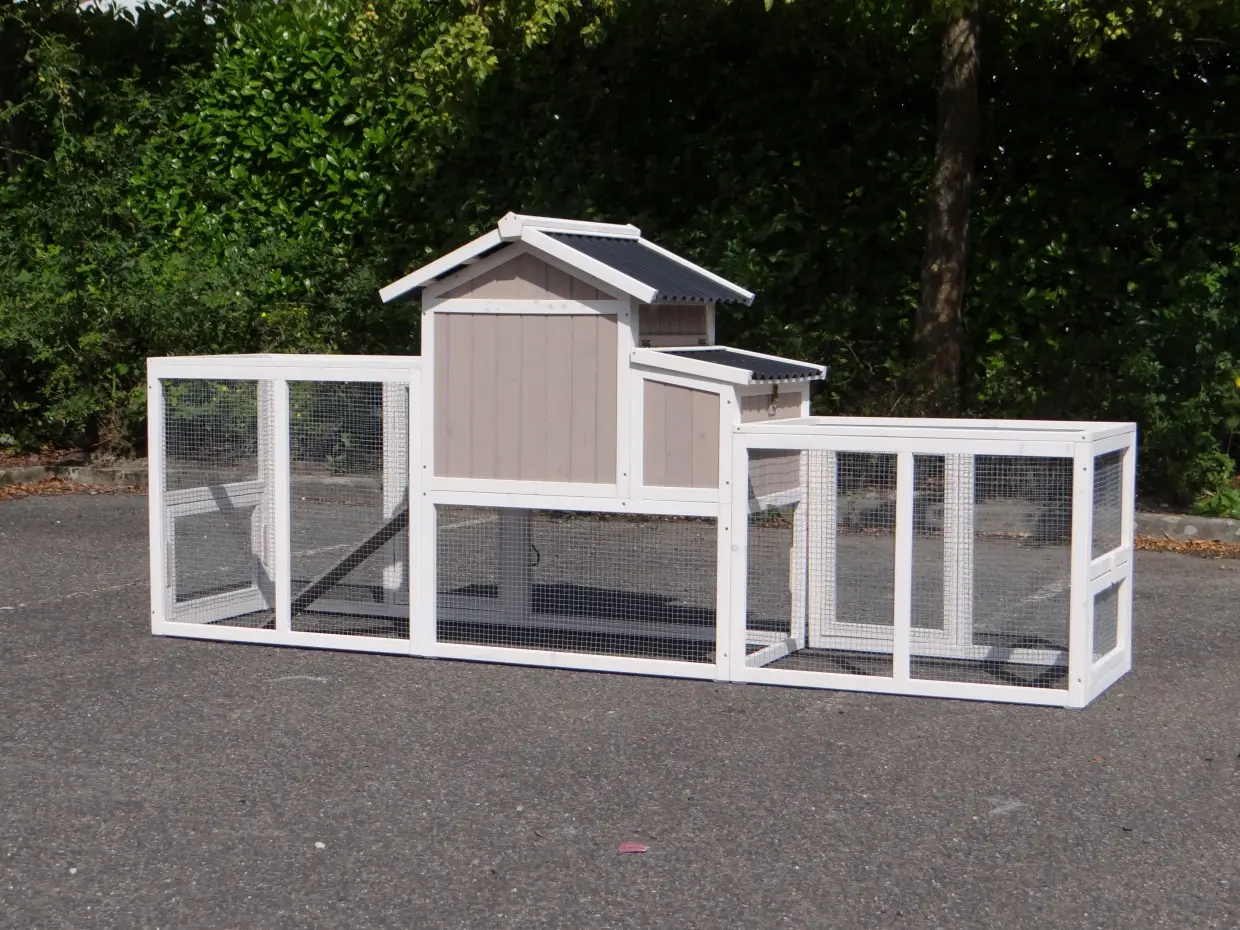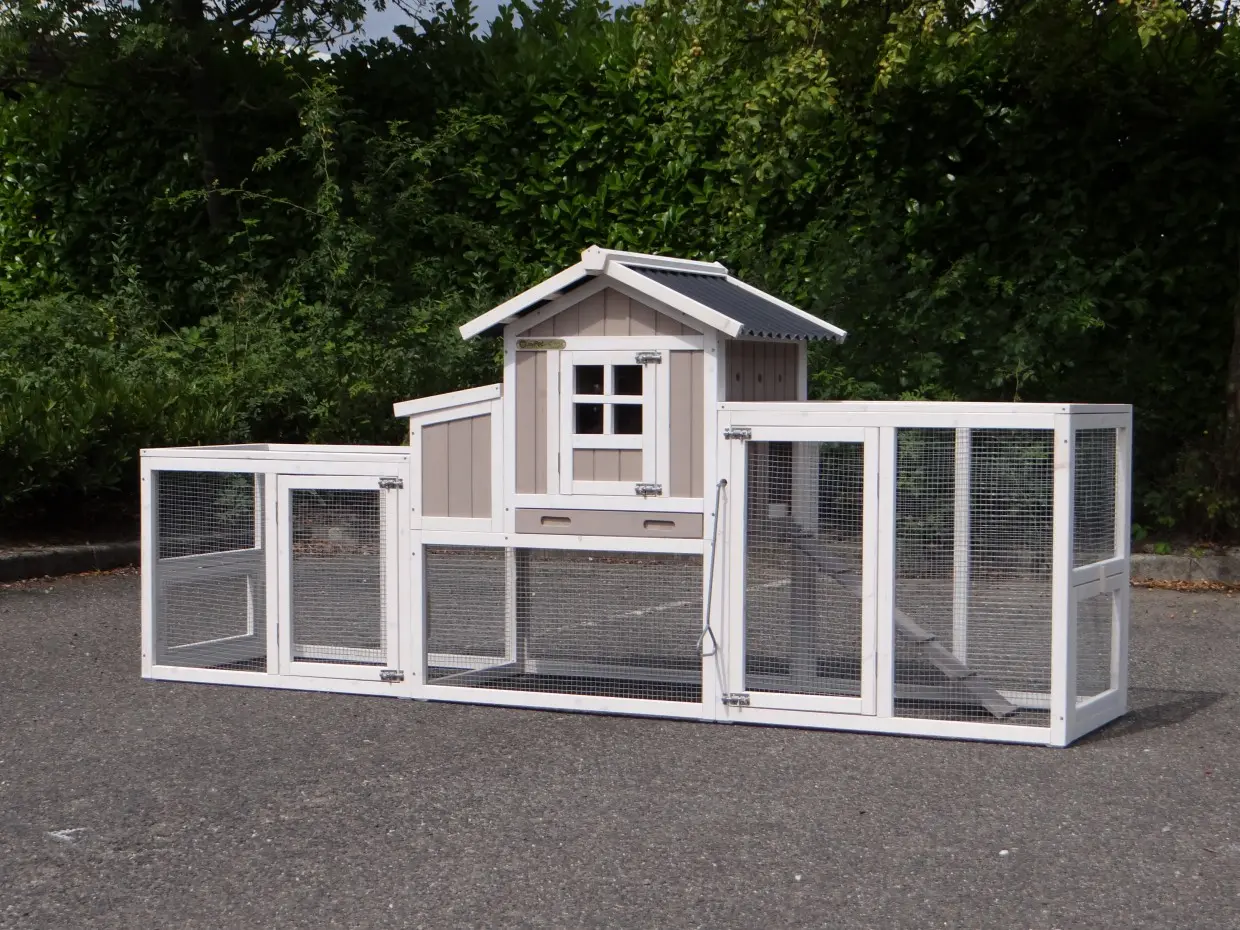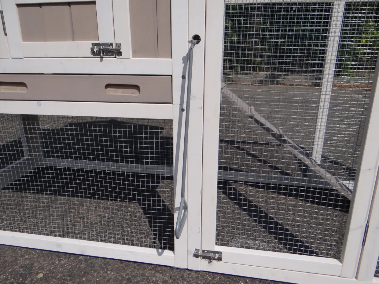 - Um diesen Stall mit einem Auslauf zu kombinieren, muss eine Tür oder ein Gitterteil entfernt werden.