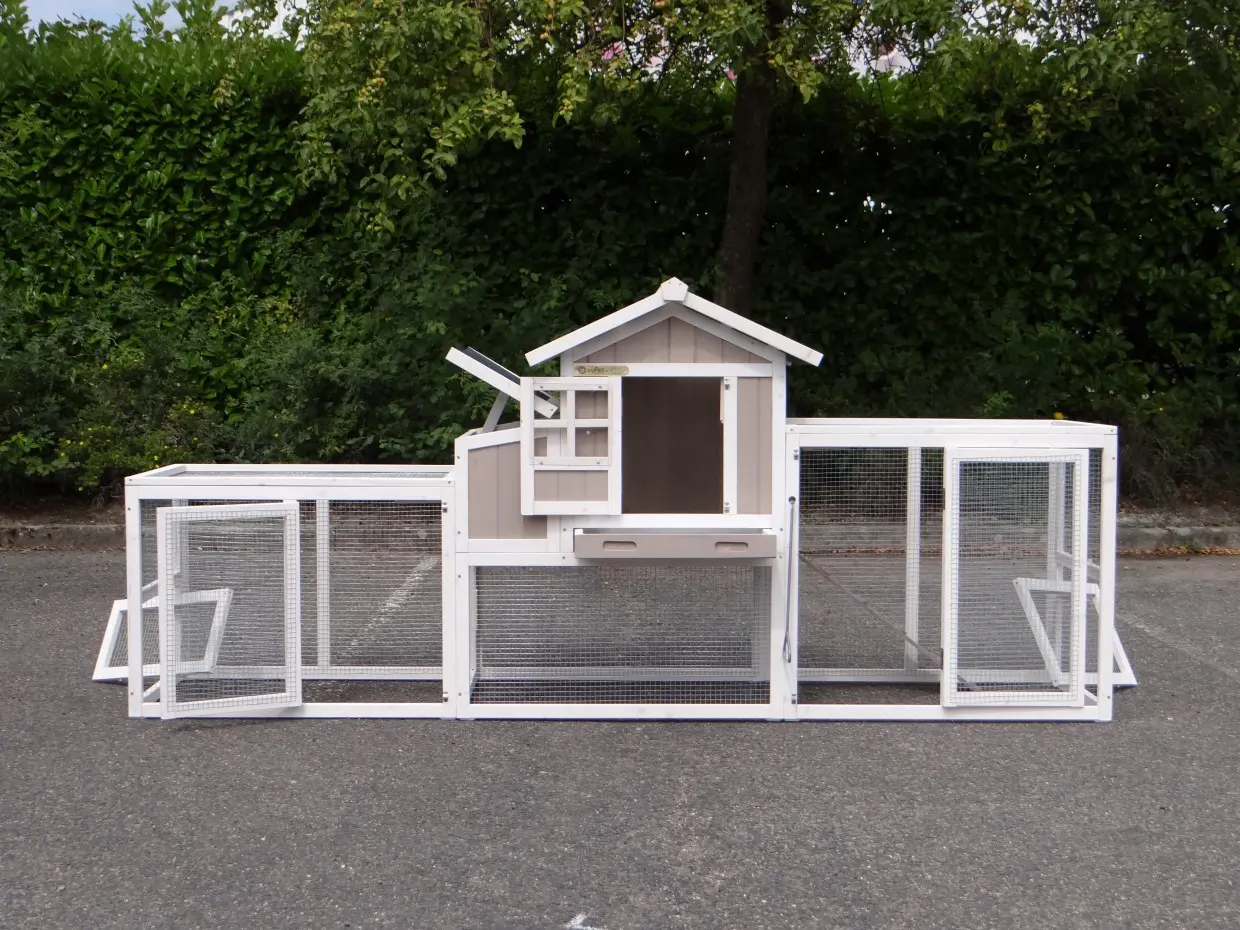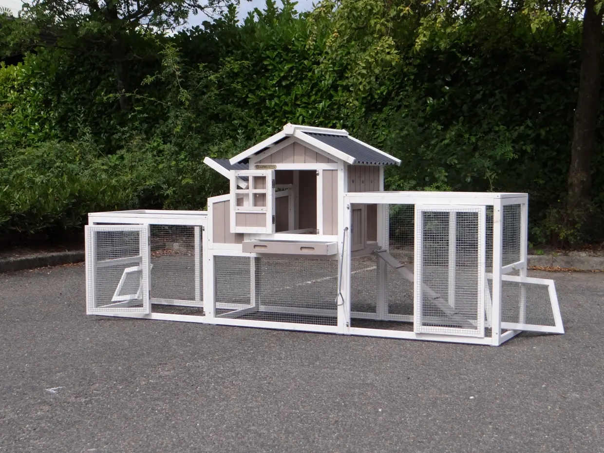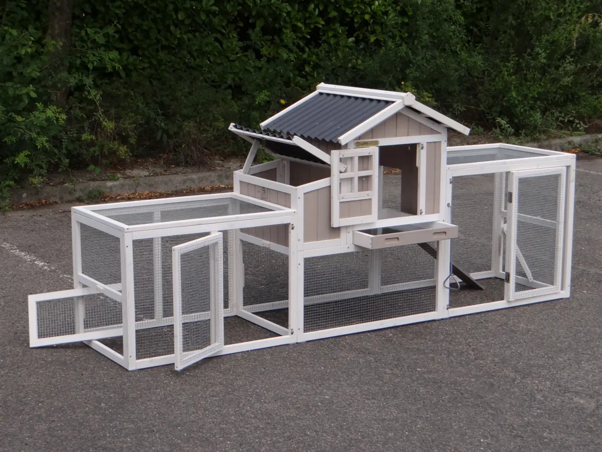- Um diesen Stall mit einem Auslauf zu kombinieren, muss eine Tür oder ein Gitterteil entfernt werden.