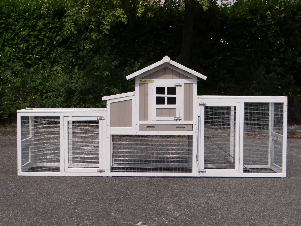 Diese Kaninchenstall Joas ist erweitert mit 2 Ausläufe. Diese Stall hat 2 Ausläufe, und auch ein Nistkaste. Diese Stall bietet Platz für 2 Kaninchen. Der Kaninchenstall wird geliefert in die abgebildete Farben. Die maximale Abmessungen, inklusives Dach und Ausläufe, sind 255x75x114cm.