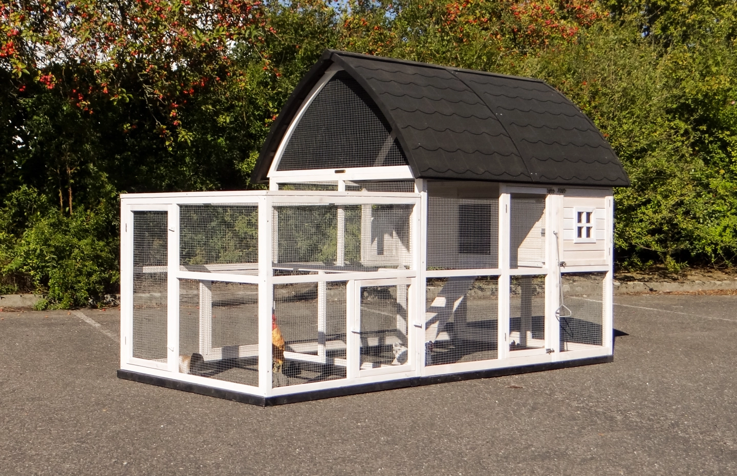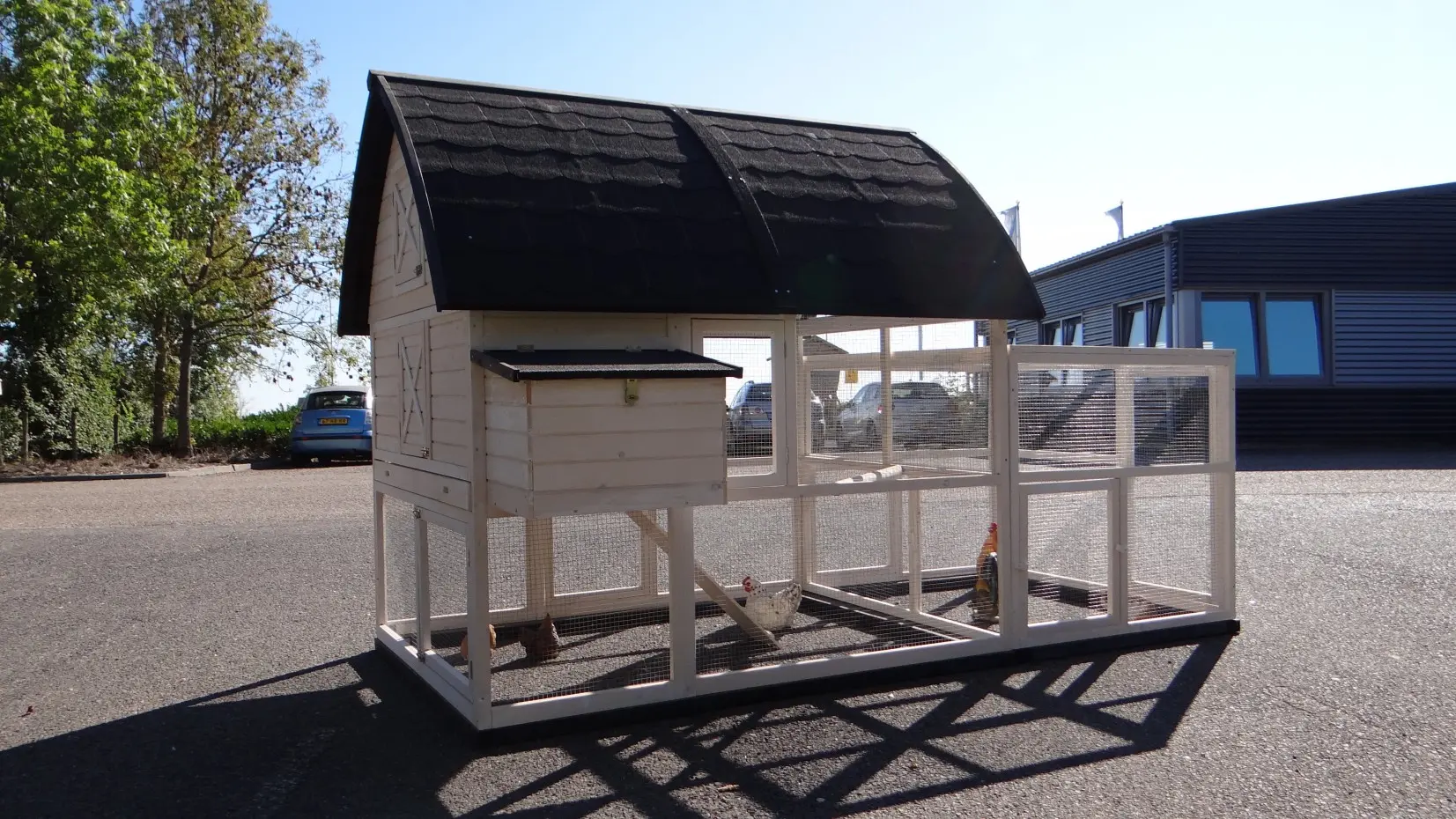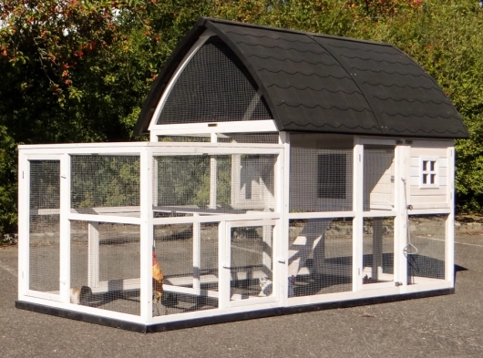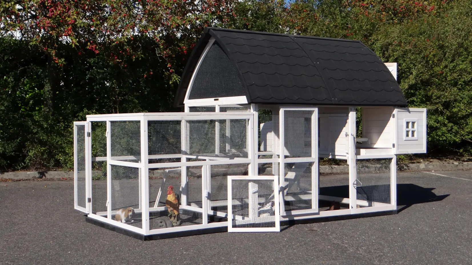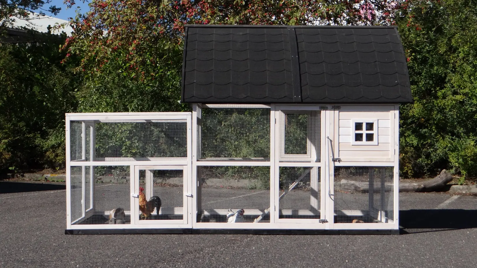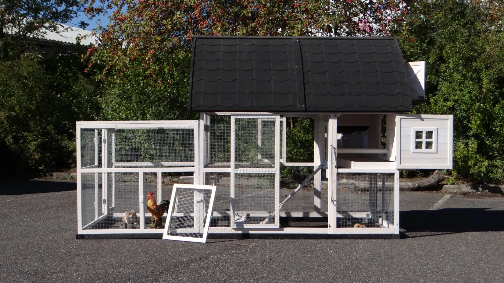 - Um diesen Stall mit einem Auslauf zu kombinieren, muss eine Tür oder ein Gitterteil entfernt werden.
