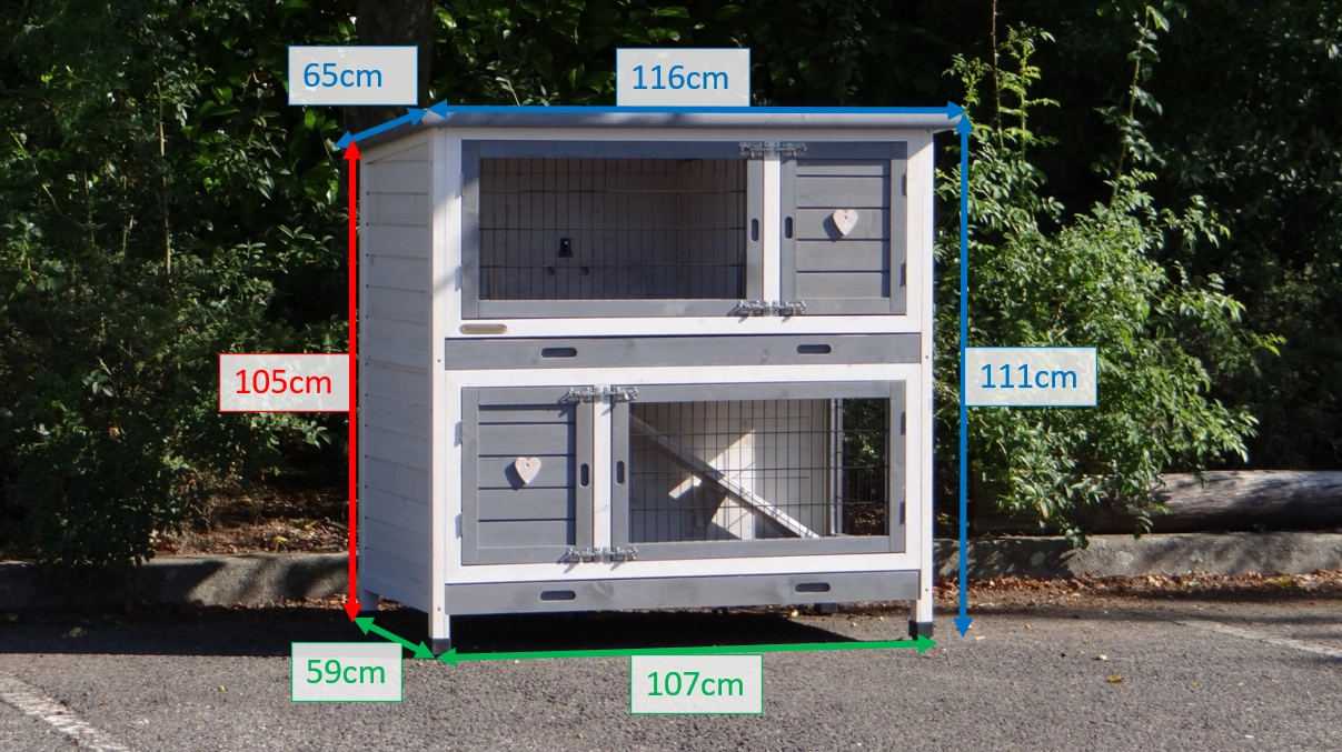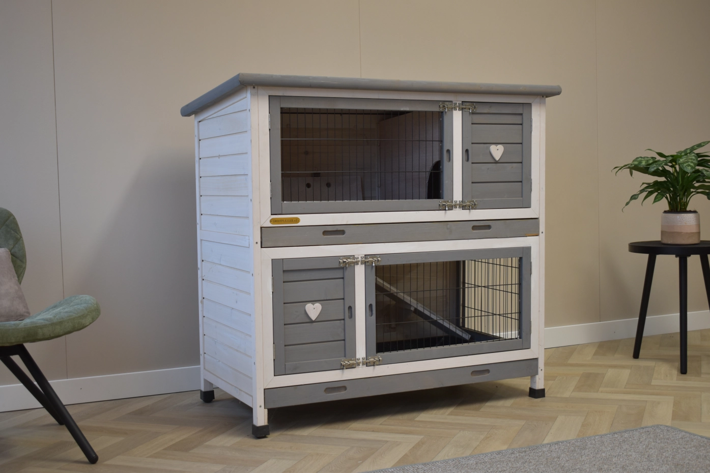 Kaninchenstall Kim is ein praktische Stall mit 2 Etagen. Der obener Etage ist abschließbar. Der Kaninchenstall hat 2 herausnehmbare Kunststoff Schubladen, große Türen und ein Klappdach, um der Stall leicht zu können reinigen. Der Stall aus Holz Kim ist ausgestattet mit Nageschutzstreifen. Der Stall hat verstellbare Kunststoff-Füßen. Die maximale Abmessungen, inkl. Dach, sind 116x65x111cm.