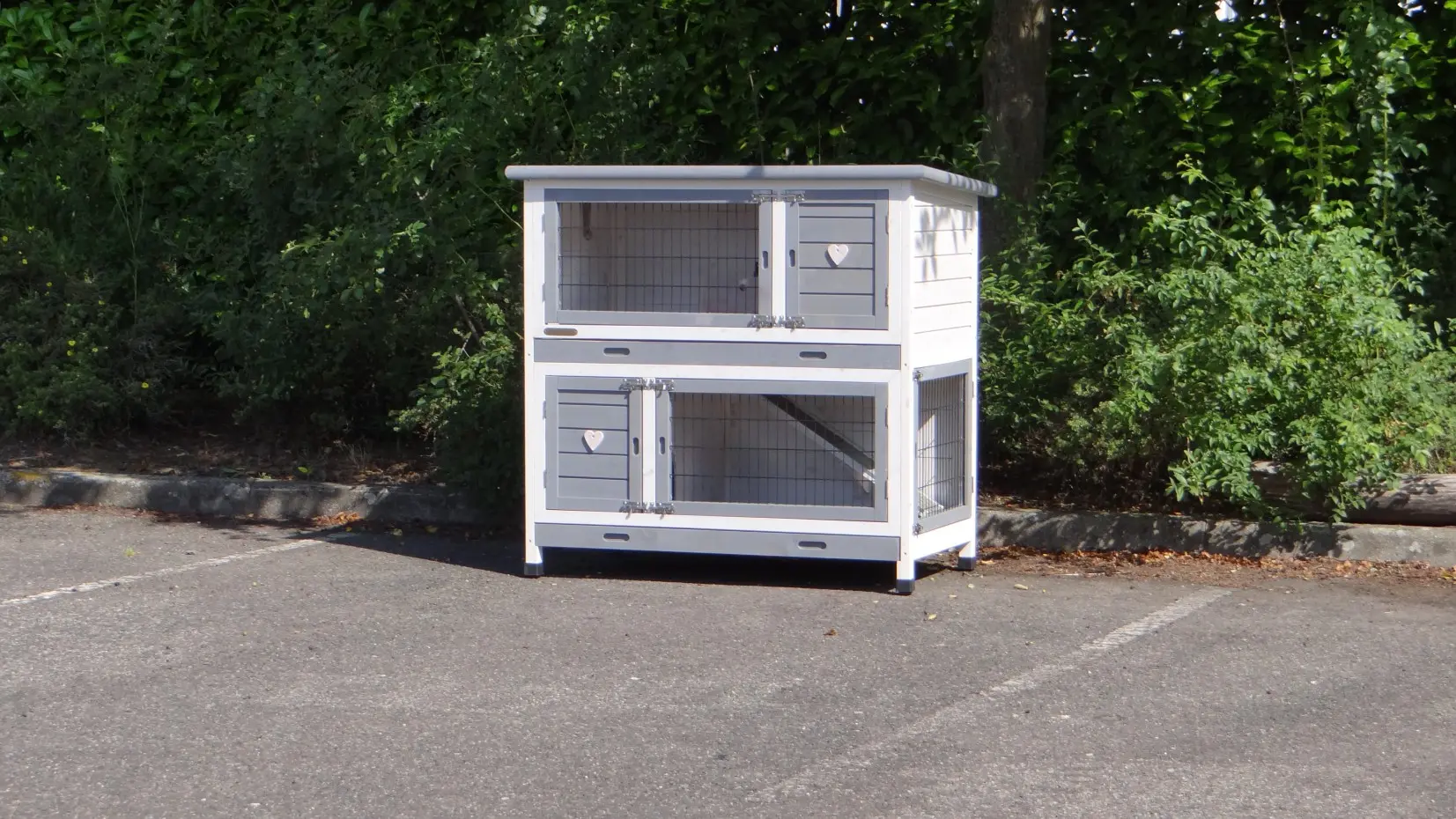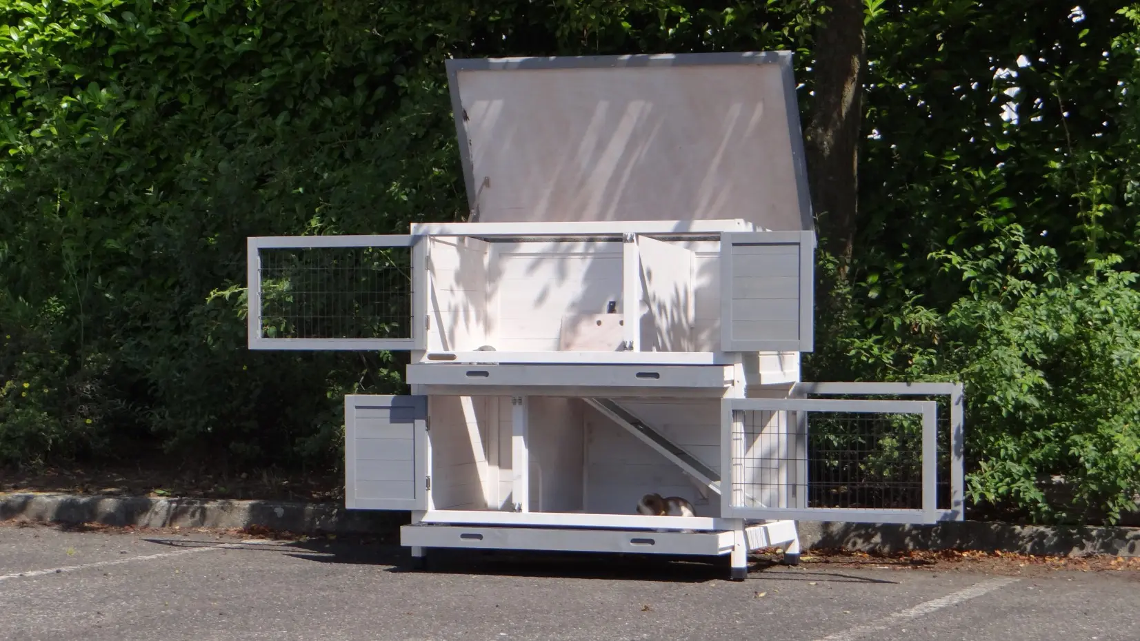 - Die Türen dieses Kaninchenstalls sind mit doppelten Schieberiegeln ausgestattet