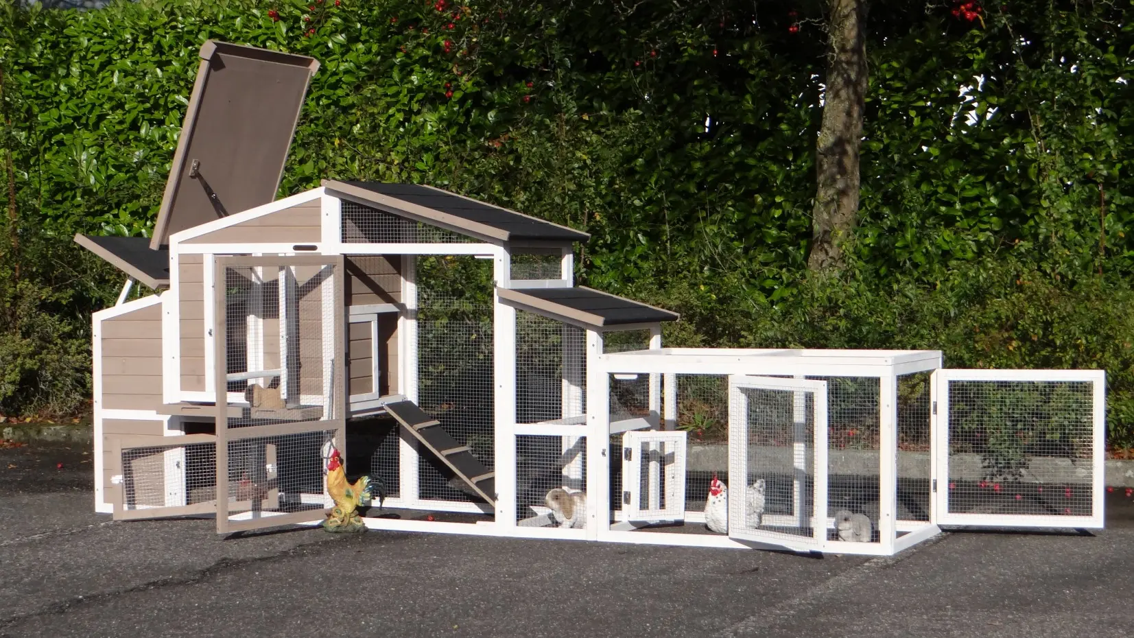 - Um diesen Stall mit einem Auslauf zu kombinieren, muss eine Tür oder ein Gitterteil entfernt werden.