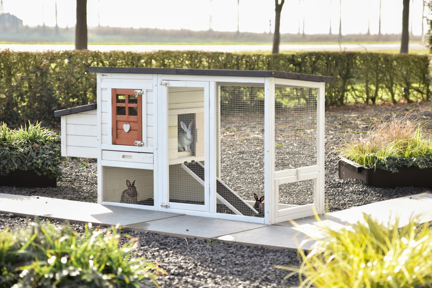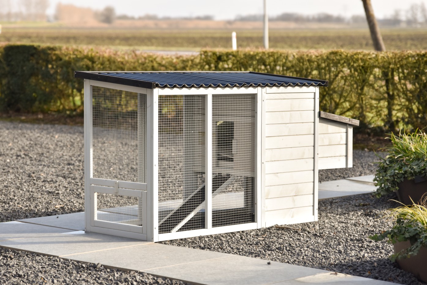 - Das Dach dieses Kaninchenstalls ist von Kunststof.