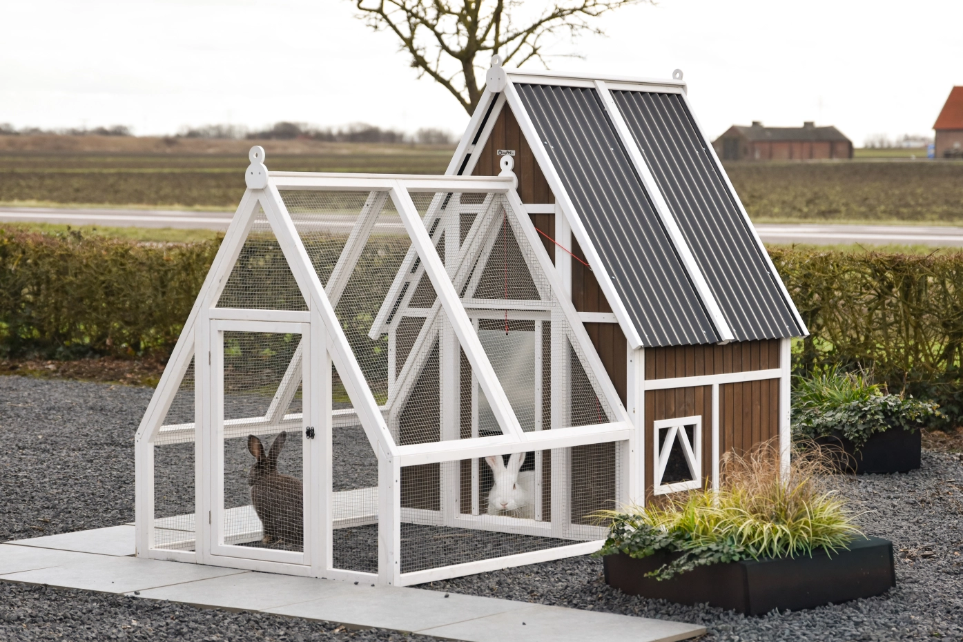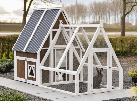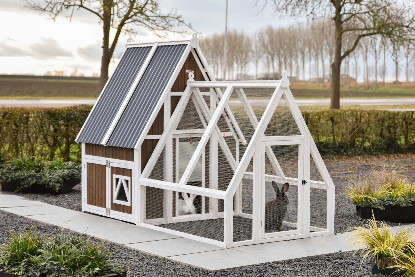 Kaninchenstall Pip mit Auslauf ist ein geräumiger und praktischer Stall mit klassischem Satteldach, geeignet für die Haltung mehrerer Kaninchen. Dank der großzügigen Abmessungen ist dieser Stall auch hervorragend für Belgische Riesen geeignet. Der offene Giebel sorgt für zusätzliche Höhe im Schlafbereich, während der geräumige Auslauf ausreichend Bewegungsfreiheit für größere Rassen bietet.