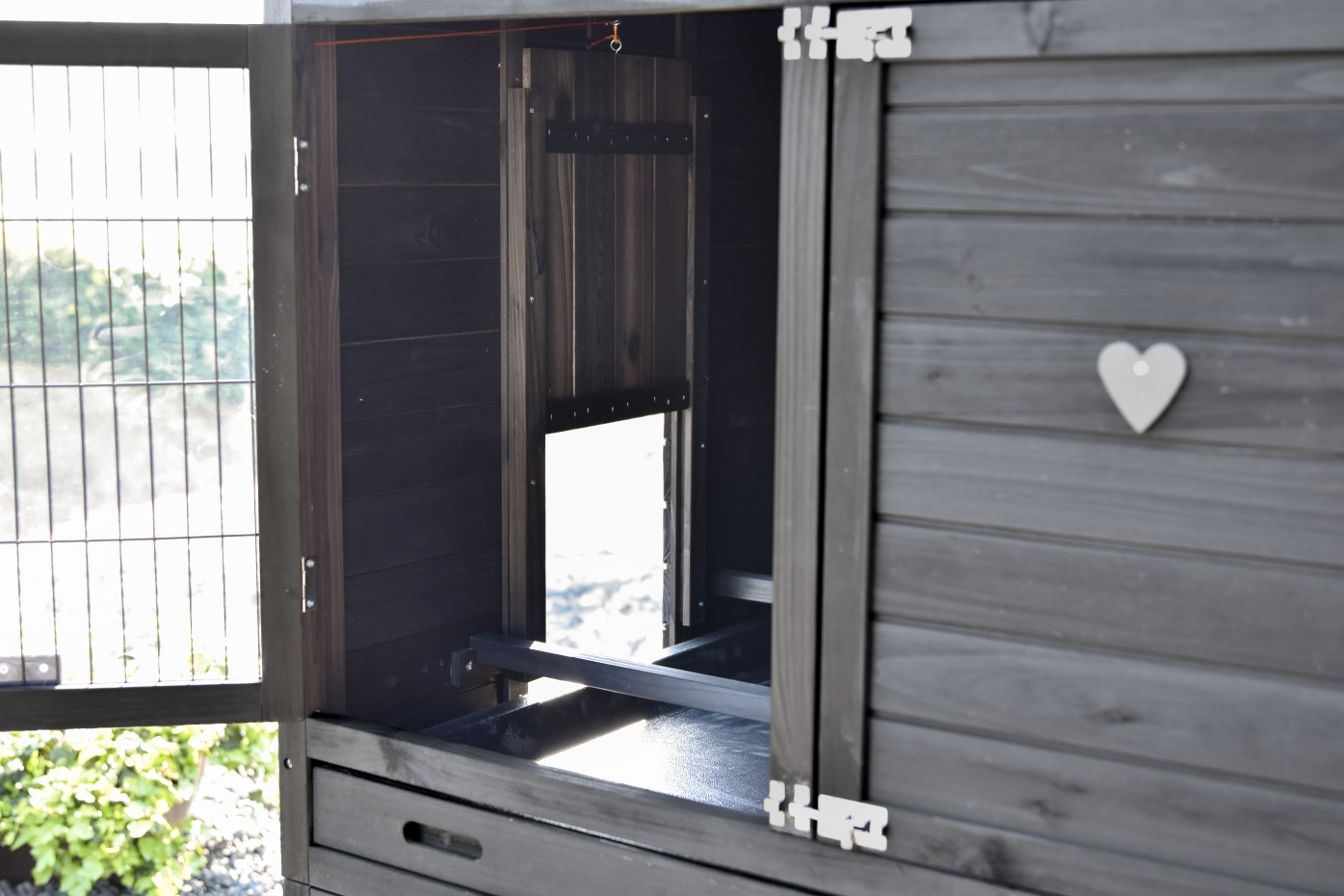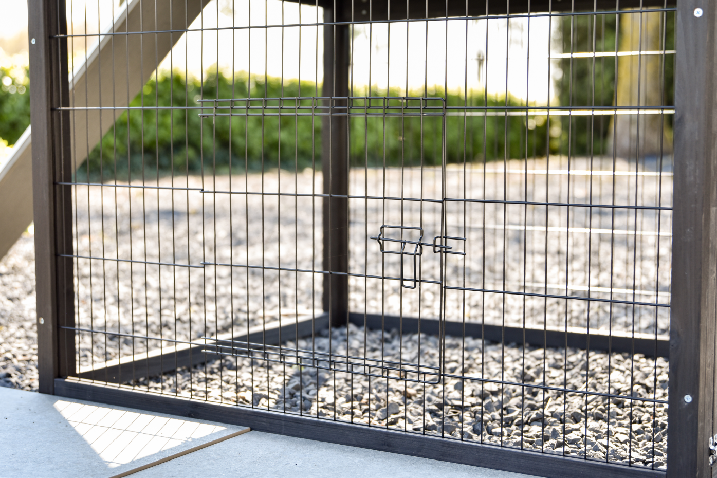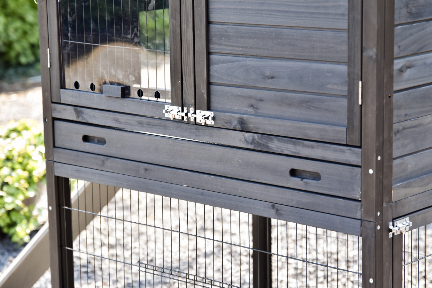 - Die Türen dieses Kaninchenstalls sind mit doppelten Schieberiegeln ausgestattet