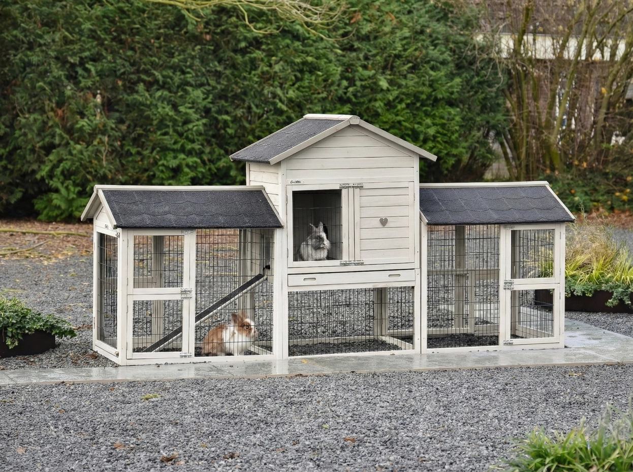 - Die Türen dieses Kaninchenstalls sind mit doppelten Schieberiegeln ausgestattet