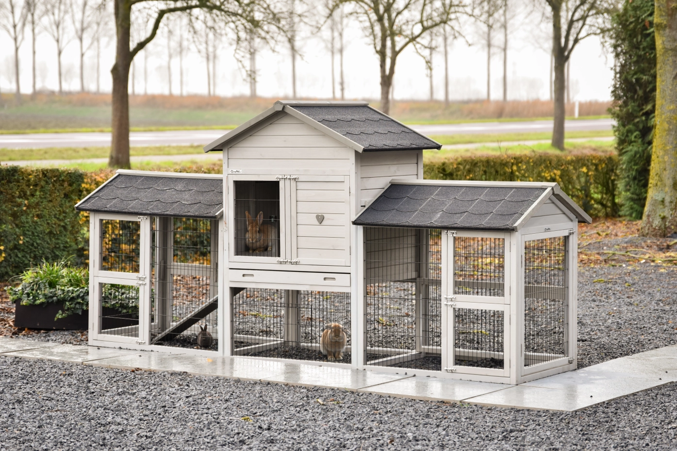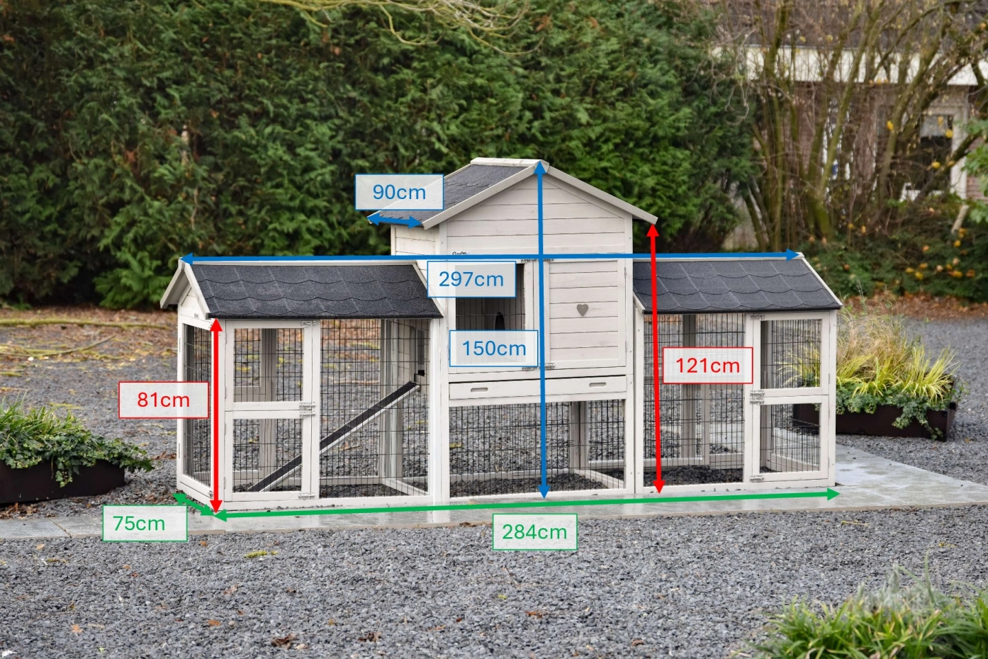 Der Kaninchenstall Prestige Medium ist erweitert mit 2 Ausläufe Space Medium. Der Stall hat Nageschutzstreifen und viel, große Türen (mit Doppelschlösser). Der Stall steht auf gummi Füßen, hat ein praktisch Stauraum, abschließbar Schlafraum und ein herausnehmbare Schublade. Kaninchenstall Prestige Medium ist ein schöne, praktische Stall. Maximale Abmessungen: 299x90x150cm. Mit ein kleine Anpassung können Sie diese Stall spiegelverkehrt aufbauen.