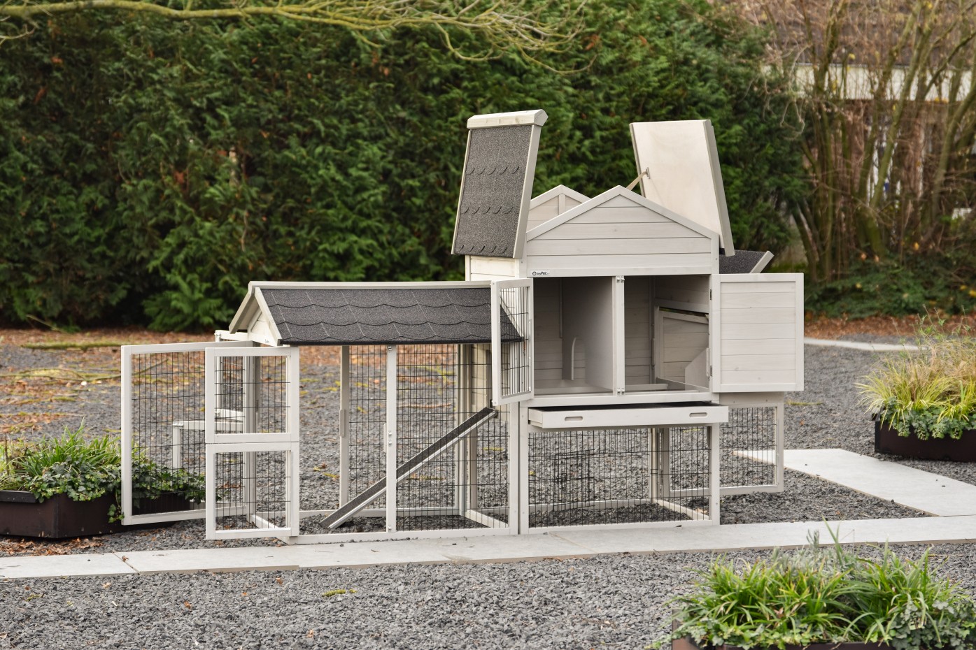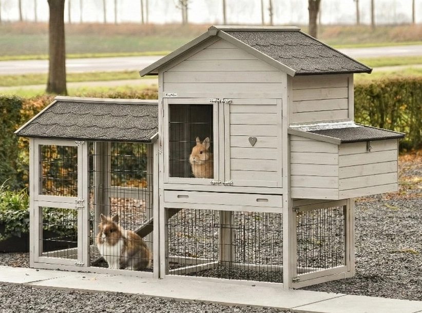 - Die Türen dieses Kaninchenstalls sind mit doppelten Schieberiegeln ausgestattet