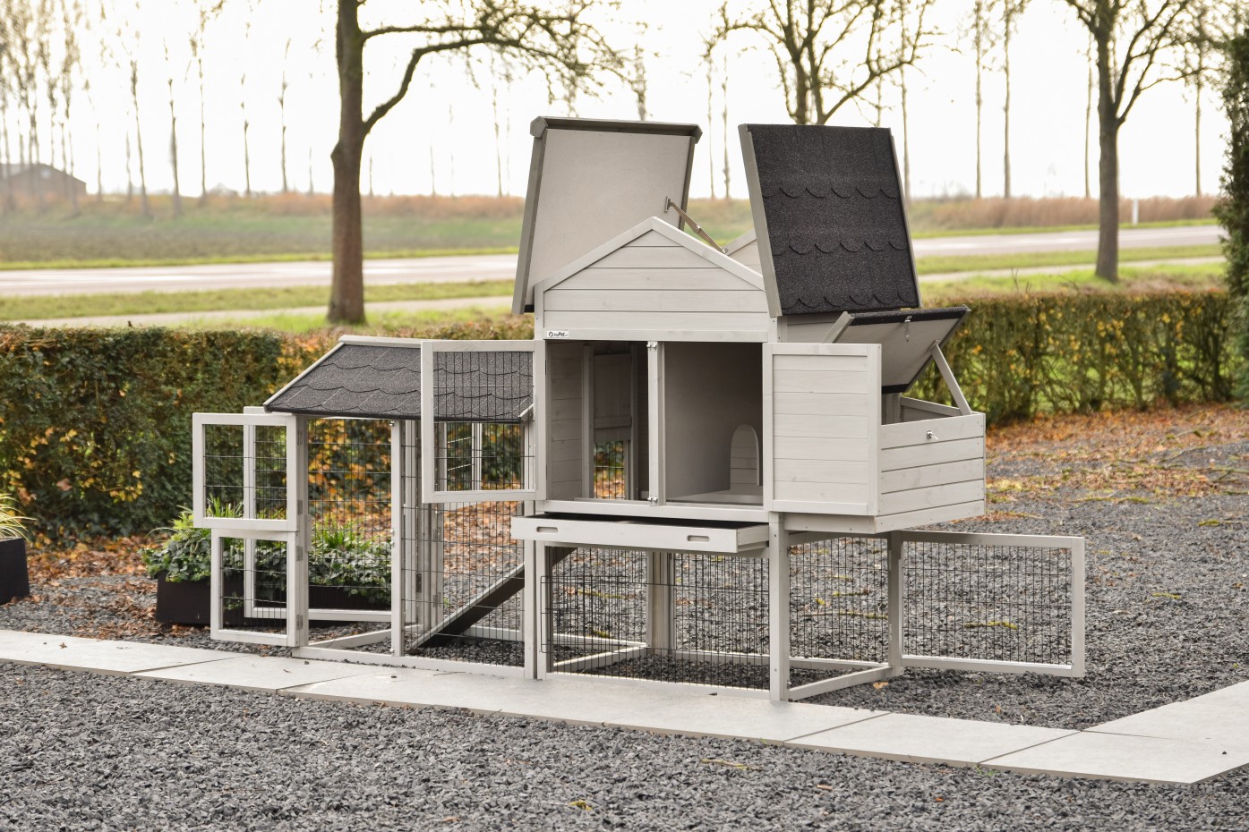 - Der Stall ist an empfindlichsten Stellen mit Nageschutzstreifen ausgestattet. Für ungeschützte Ränder können Sie Nagerschutzstreifen bestellen.