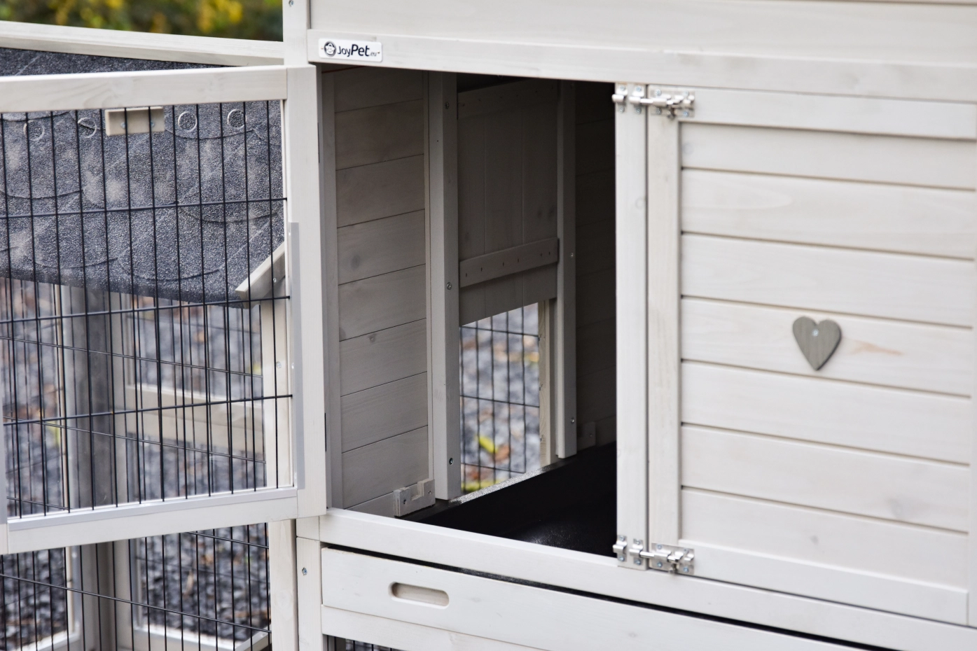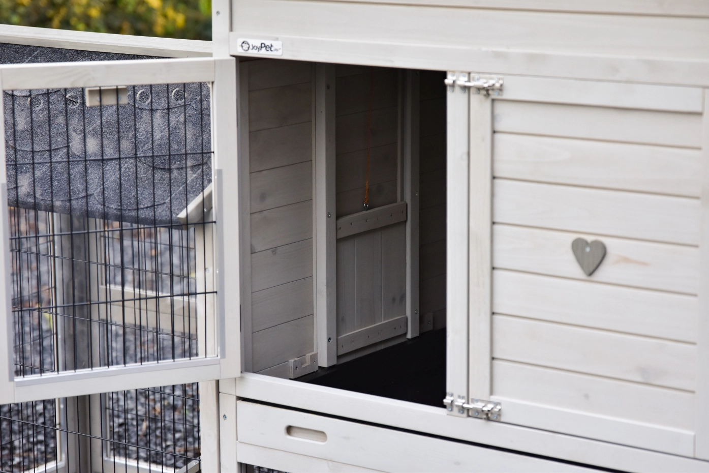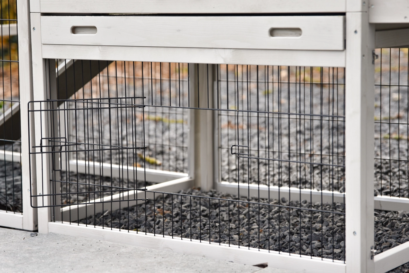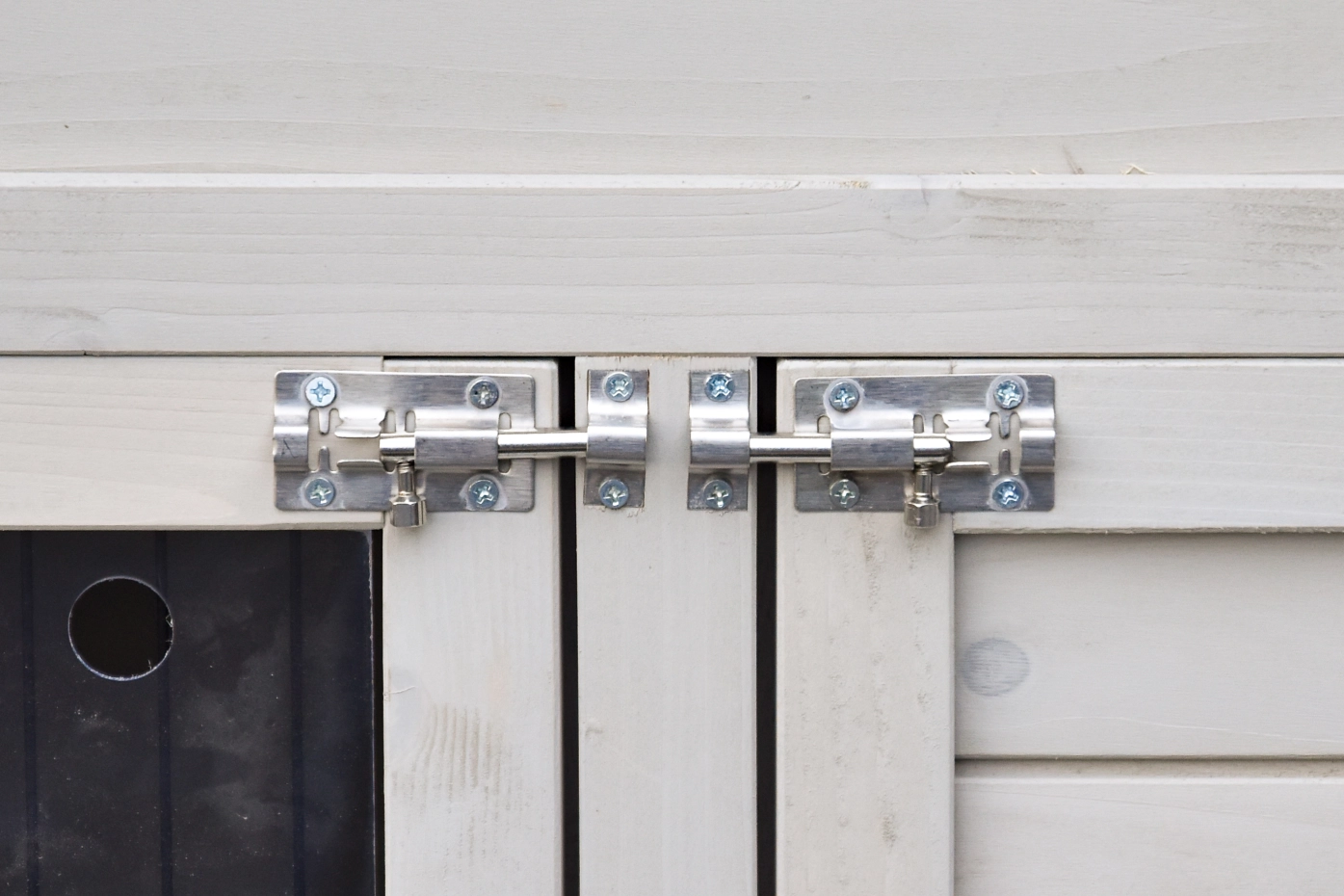 • Die Türen dieses Kaninchenstalls sind mit doppelten Schieberiegeln ausgestattet